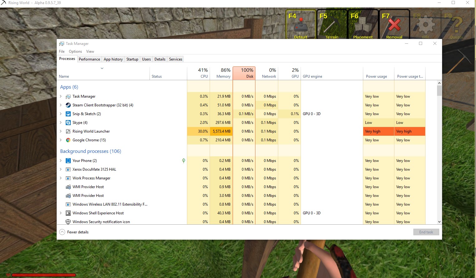 When I have Rising World running task manager shows DISK at 7% and CPU at 100%