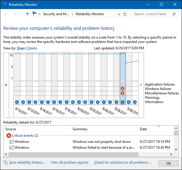 To open it in Windows 10, right click windows icon bottom left of screen , click on search and type in reliability.