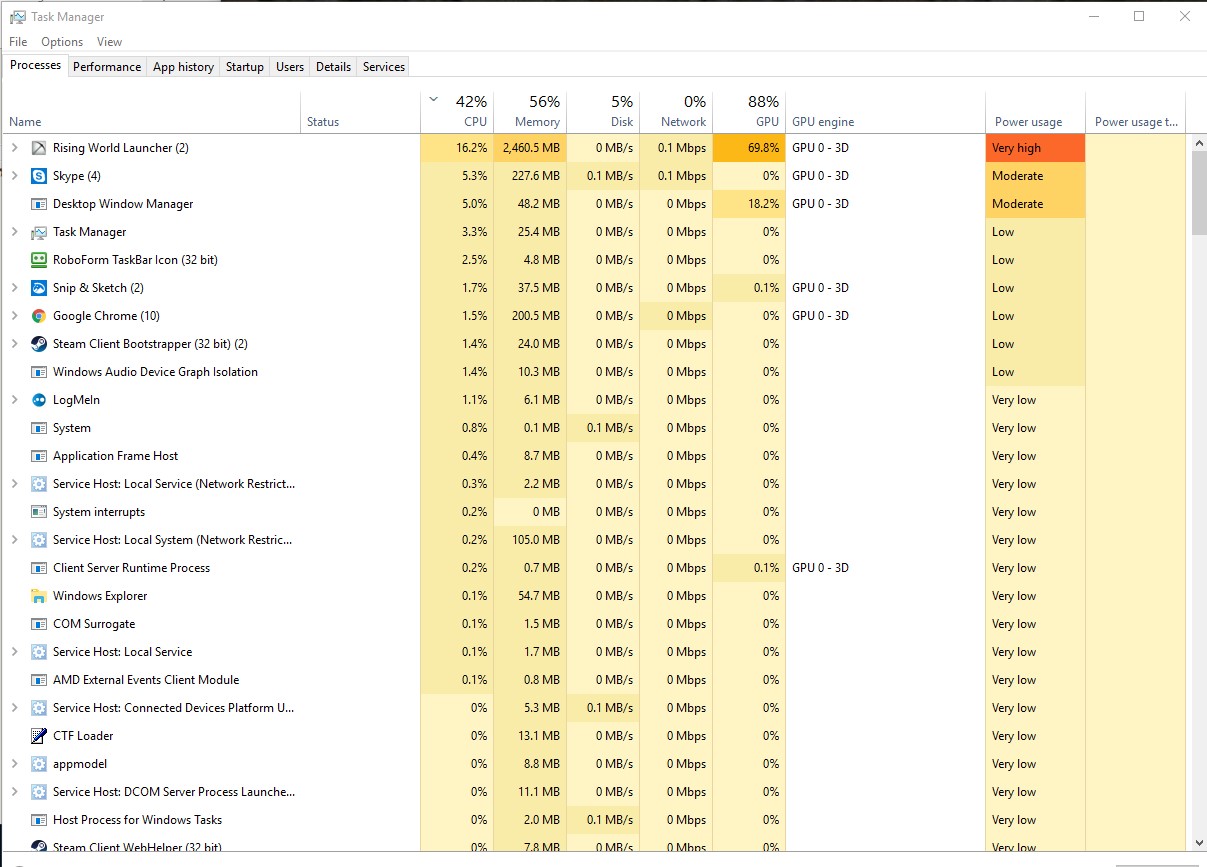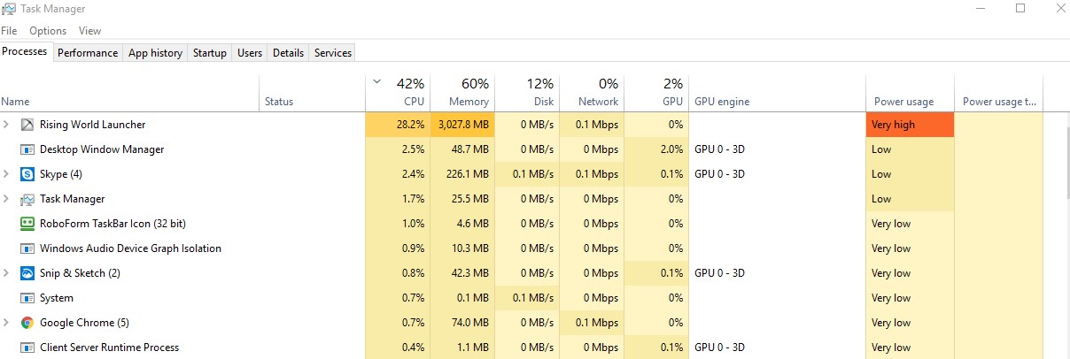 Your first screenshot of task manager shows you are using 49% of your 12 gig of memory and Rising World was using less than 2 gig of memory. If you click on the details tab in task manager and then click once on where it says memory the software using the most memory is at the top of the list. Check if it is Rising World or something else.