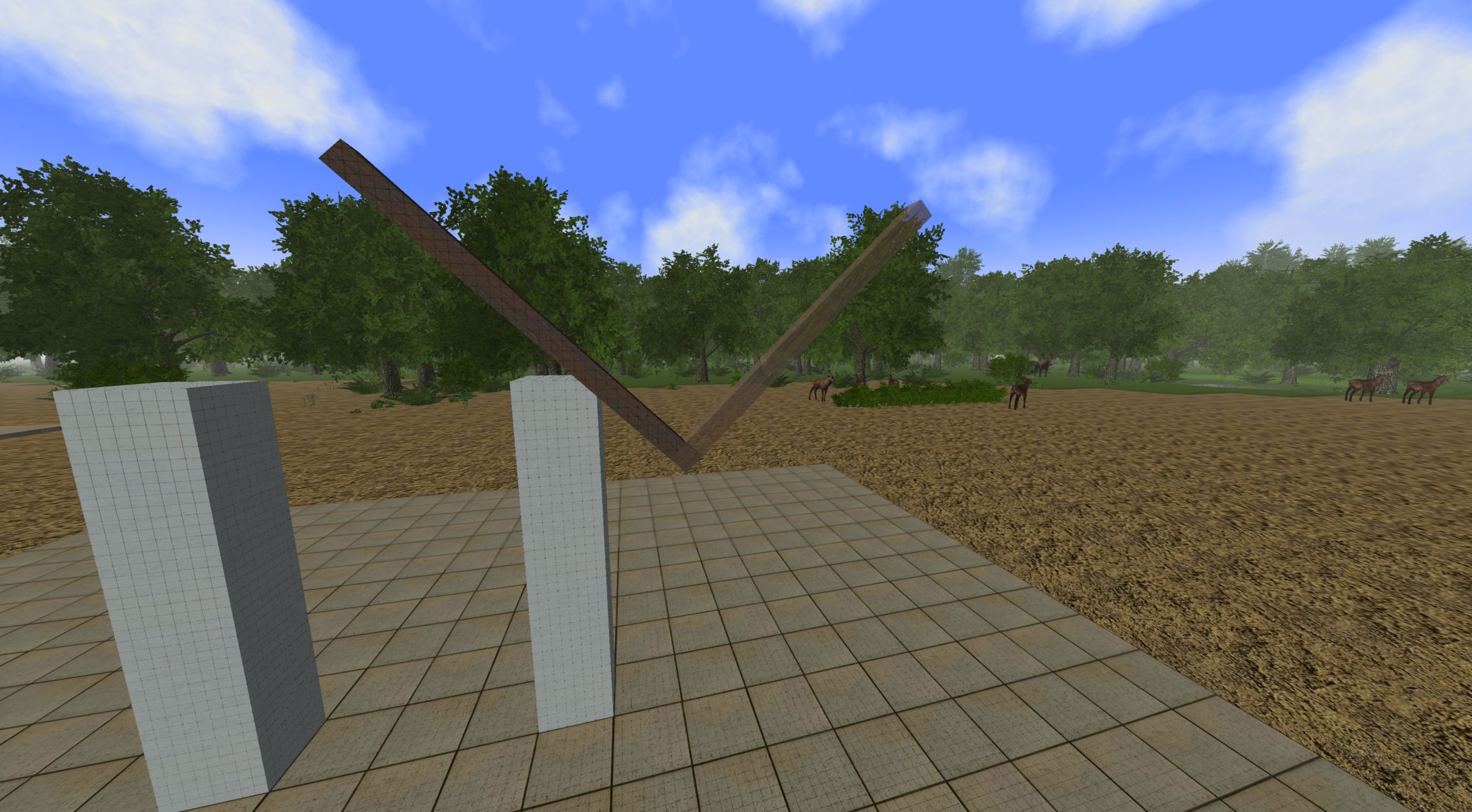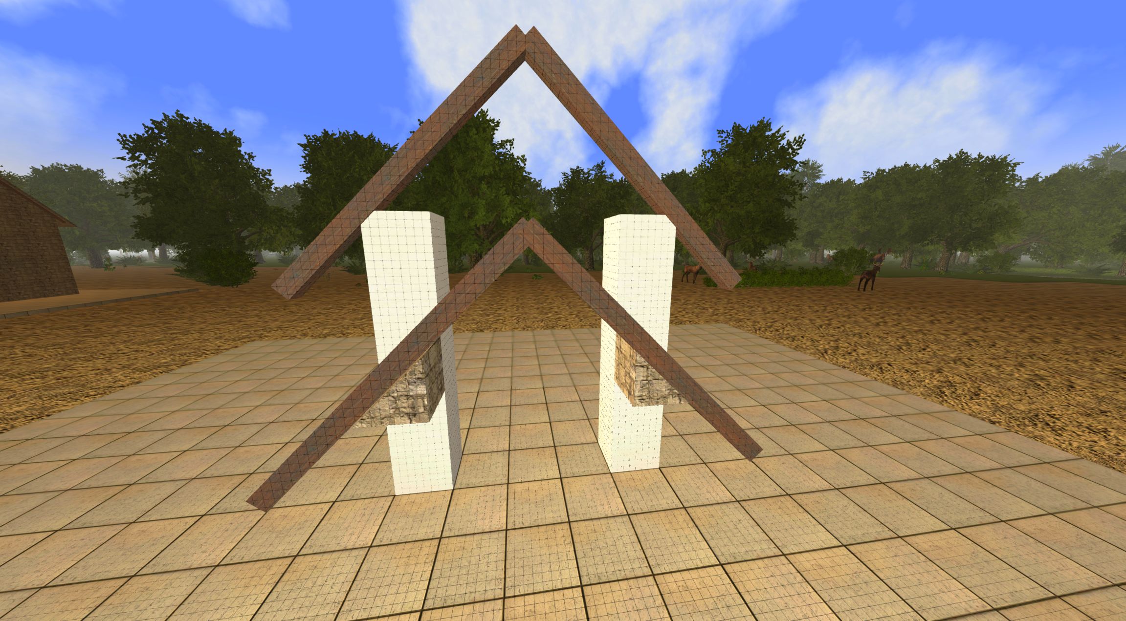 - now with another beam in hand (you may want to lengthen it a bit so when you place the second beam to form the roof the 2 beams will cross at the top) go over to one of the vertical beams you just placed and cause an " L " shape to form as you position the beam like in Picture #1. When you have achieved this hit the CTRL key which will lock it into place.