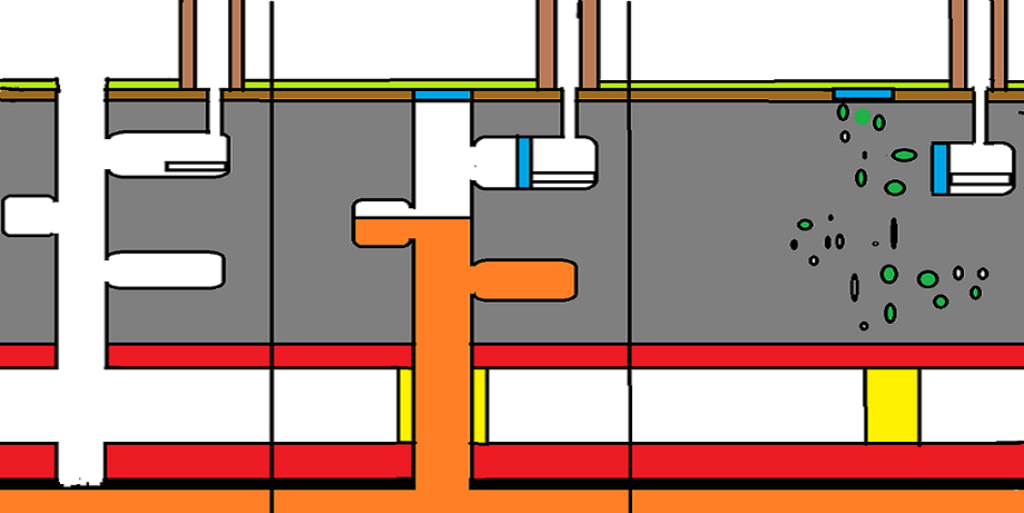 Mein Vorschlag wäre, das man unter der Hölle (Rot) eine Obsidianschicht (Schwarz) hat, unter der Lava (Orange) ist. Nachdem man alle Erze aus seinen Untergrund geschürft hat baut man einen Teil der Obsidianschicht ab. Der geschwächte Teil der Obsidianschicht bekommt Abbautextur ( als wenn jemand es mit der Keule abbauen würde). Ist die Schicht weggebrochen steigt eine Lavasäule nach oben, welche im Bereich der Hölle Höllengestein erzeugt ( Gelb), damit die hölle nicht geflutet wird. Die Lava flutet dann alle Hohlräume und kann von Gestein (Grau) und Mauerwerk (Blau) aufgehalten werden. Nach kurzer Zeit kühlt die Lava ab und wird zu dem Material, was für die jeweilige Stelle vorgesehen ist ( Erde, Stein Höllenstein, Obsidian und es bilden sich in ihr nach einer Weile neue Erze.