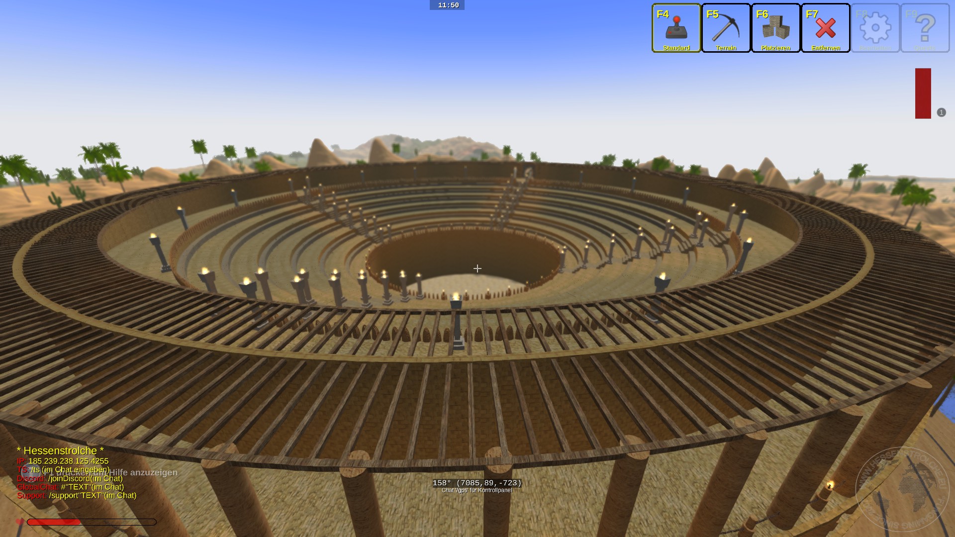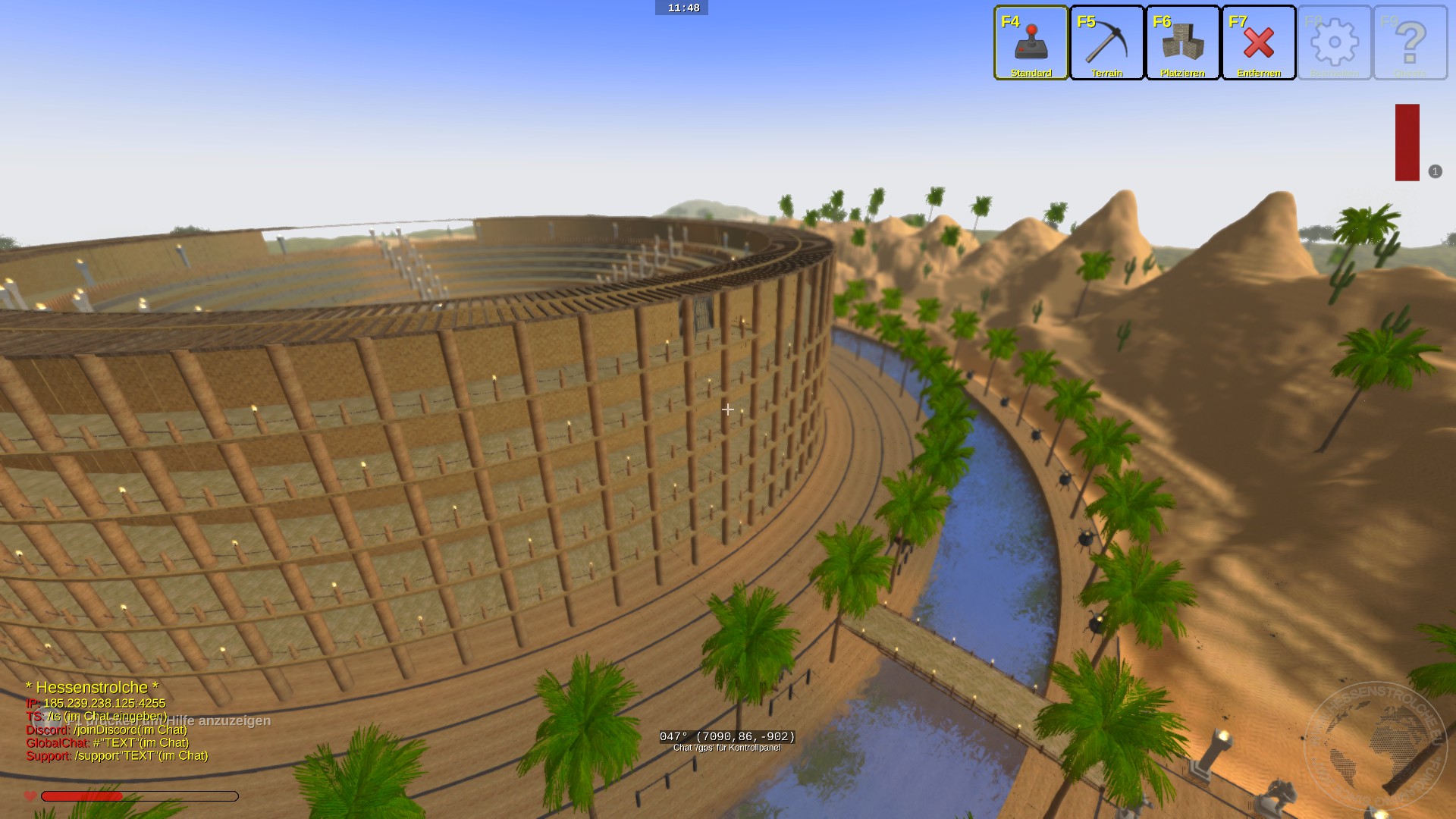 Der ganze Bau, vom Wassergraben angefangen hat einen Durchmesser von 236 Blöcken, es ist ausschließlich aus Brettern und Balken gebaut