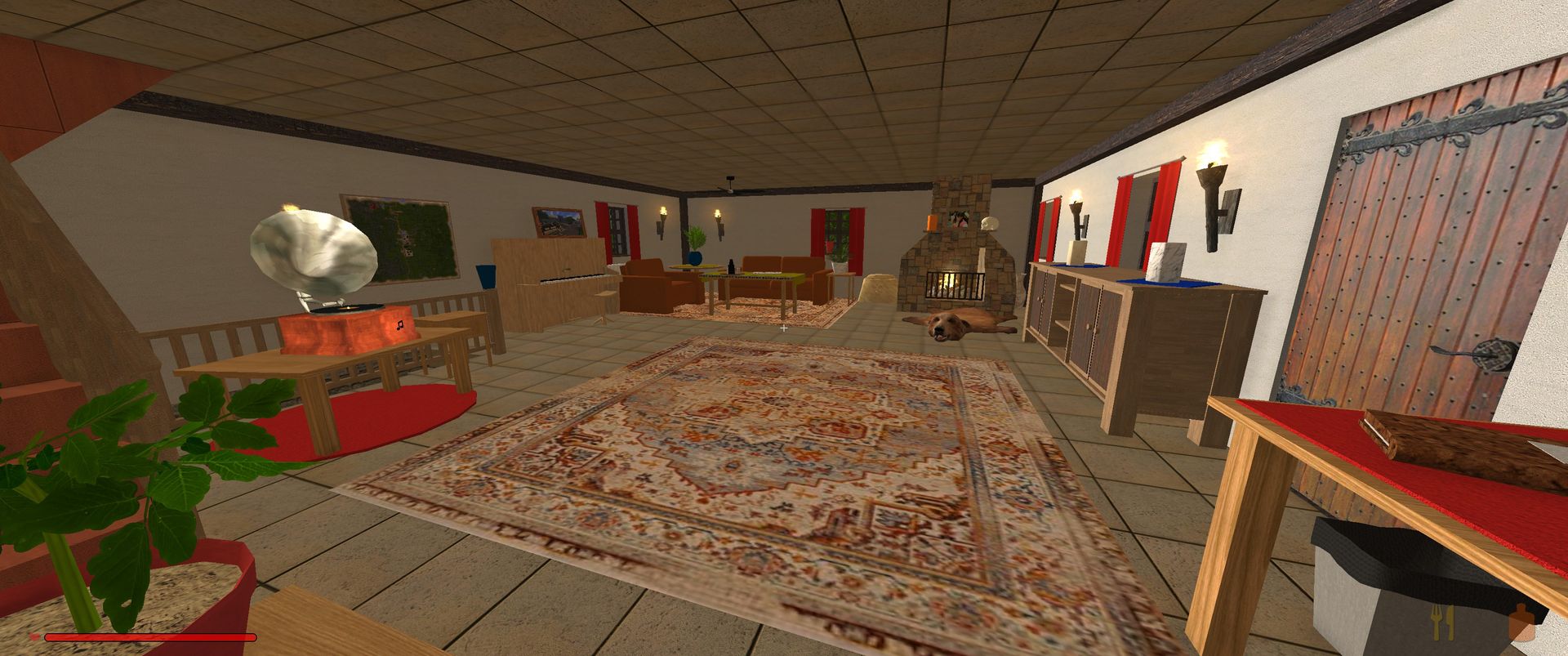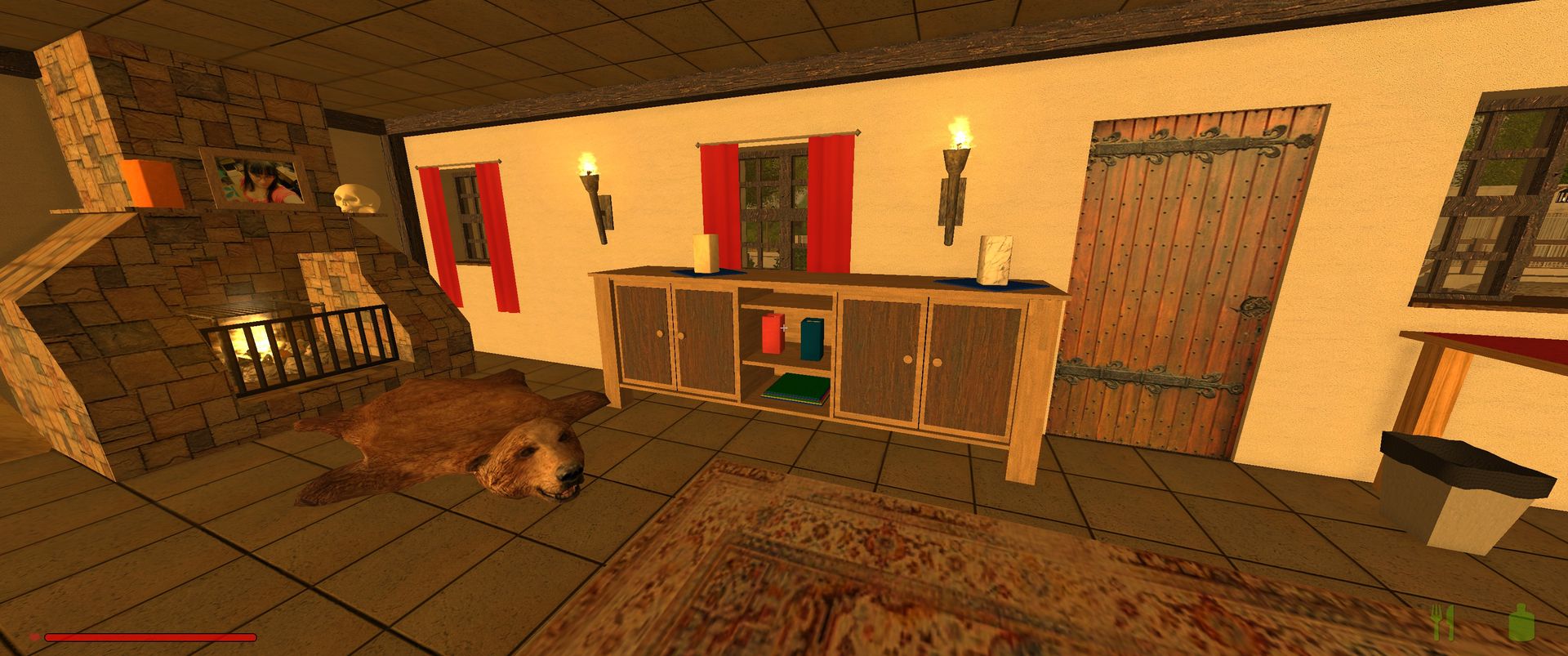 Es hat einen Keller mit Kisten und das Erdgeschoss ist eingerichtet. Oben befinden sich nur ein paar wenige Möbel.