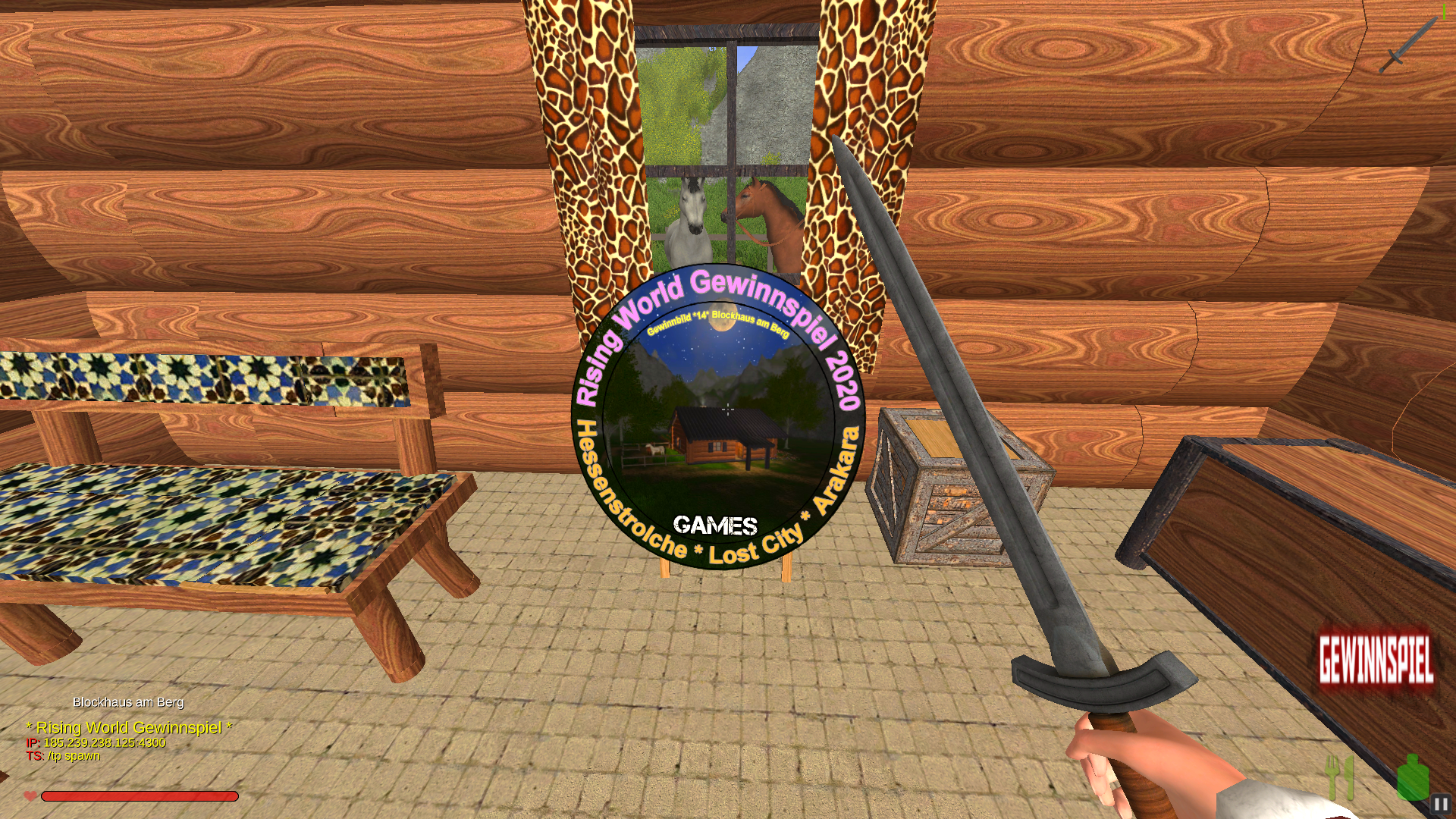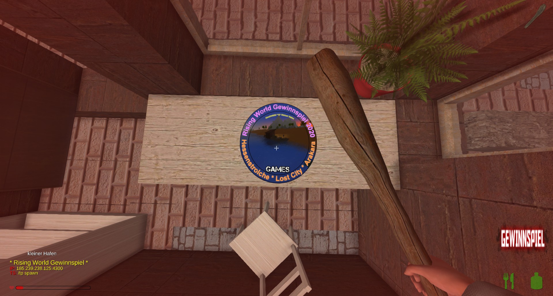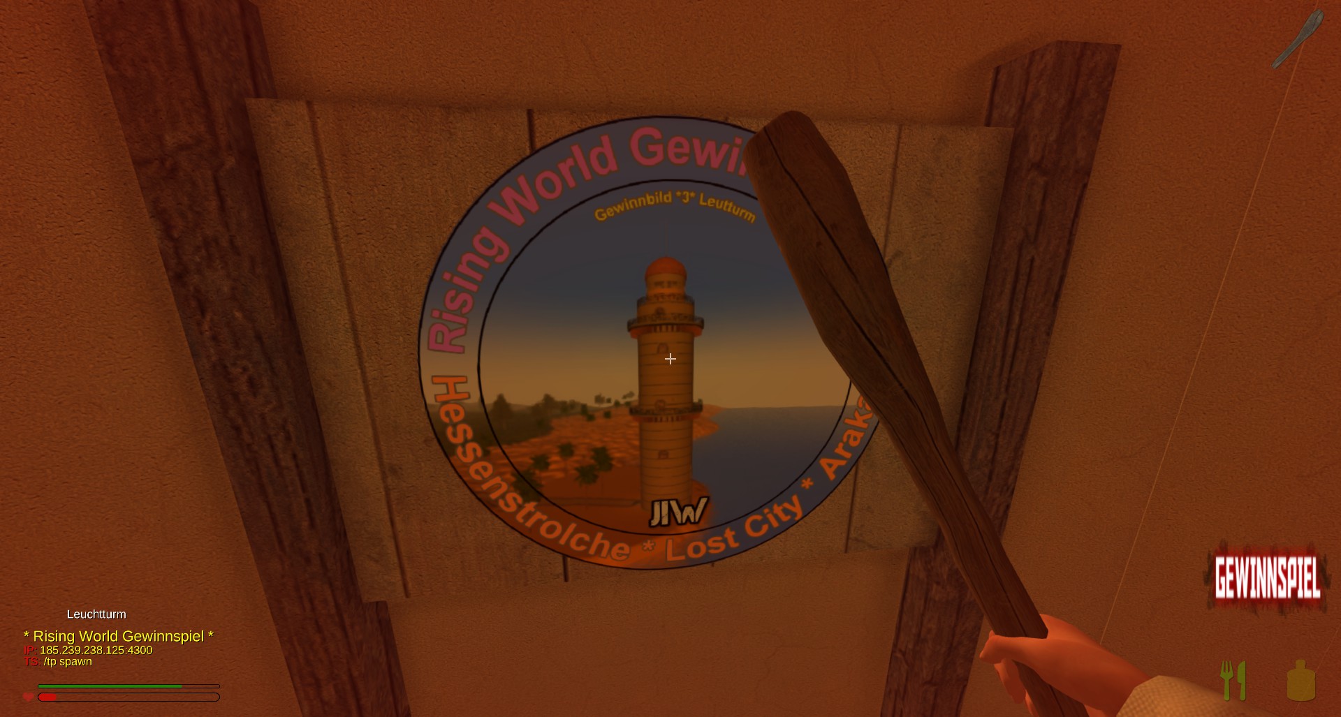 Ihr joint auf den Rising World Gewinnserver, im Journal "J" findet ihr nocheinmal die Regeln zum Spiel. Da PVP und PVE auf dem Server aktiviert ist, solltest Du dir erstmal eine ruhige Position suchen, wo Du vor anderen Spielern und auch wilden Tieren oder gar Banditen geschütz bist. Jetzt kannst du dir nochmal in Ruhe die Regeln durchlesen. Nun gilt es zwei unterschiedliche Bilder vor anderen Spielern zu finden und dann im Forum zu posten. Auf deiner Suche nach den Gebäuden solltest Du auch auf deine Gesundheit was die Nahrung angeht sowie Kleidung wegen der Witterung achten. Hilfreich sind hier die Oberirdischen Dungeons, in diesen kannst du auch Sättel für Reittiere finden um schneller die Bilder zu finden. Wenn Du mal in ein tiefes Loch fällst und nicht mehr raus kommst, kannst du den Teleport benutzen, den Befehl siehst Du unten links. Du befindest dich auf einem recht großem Areal wo wir eine große Mauer gezogen haben. Auf der anderen Seite der Mauer findest Du nichts. Wenn du kein Dungeon findest, brauchst aber einen Sattel, kannst du auch wie es im Spiel üblich ist, dass alles craften, ob dies dann schneller geht weiß keiner. Bitte wundere Dich nicht, wir haben die Taste F3 deaktiviert, damit keiner die Koordinaten verraten kann, aber ein Kompass könnte dir trozdem bei der Suche behilflich sein.