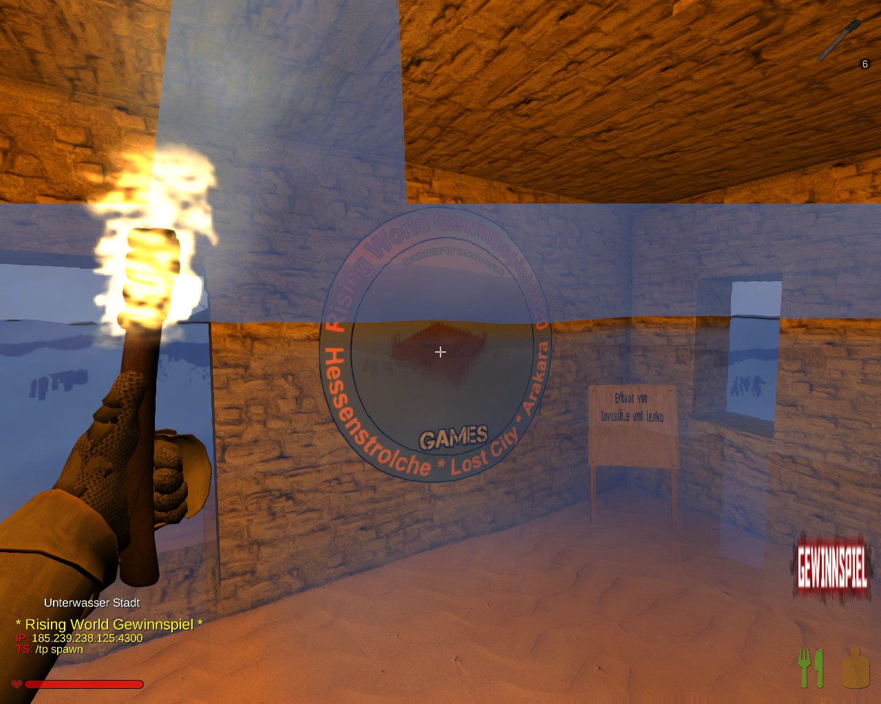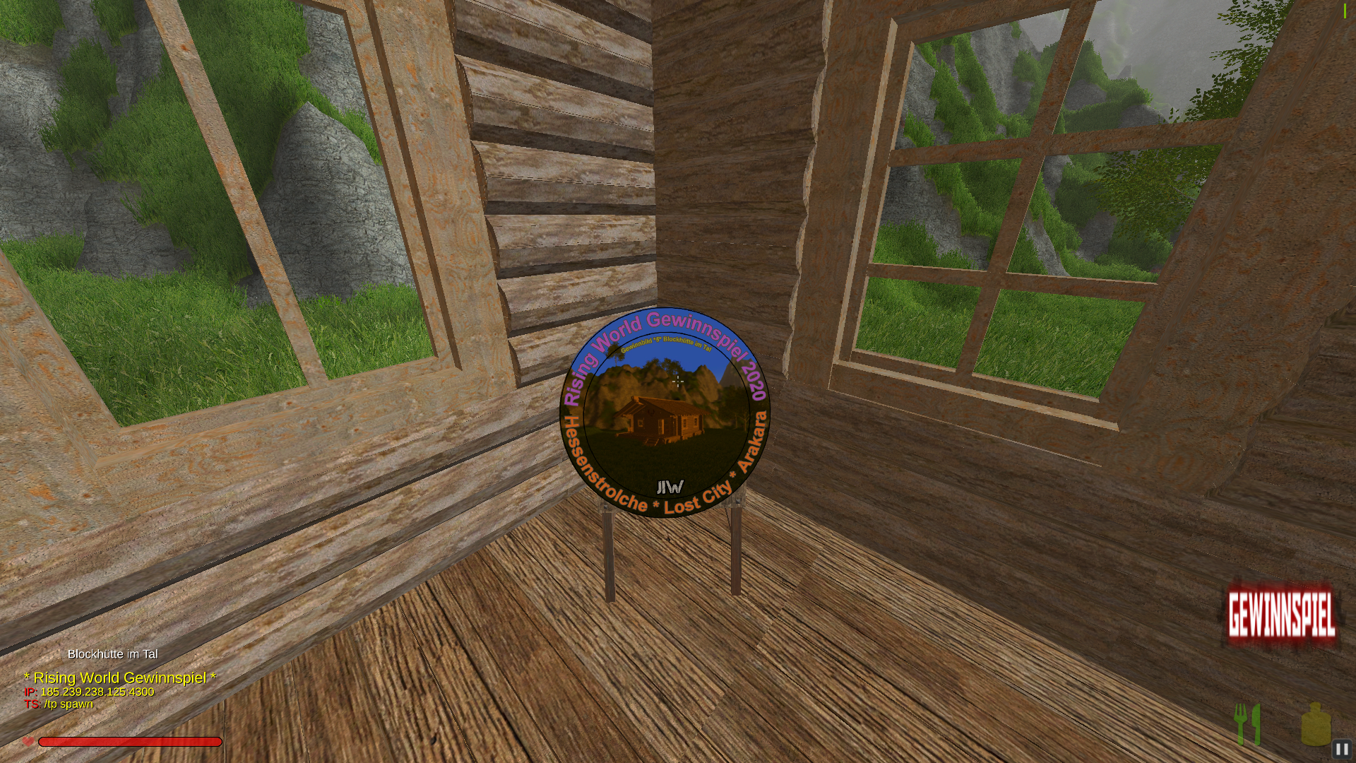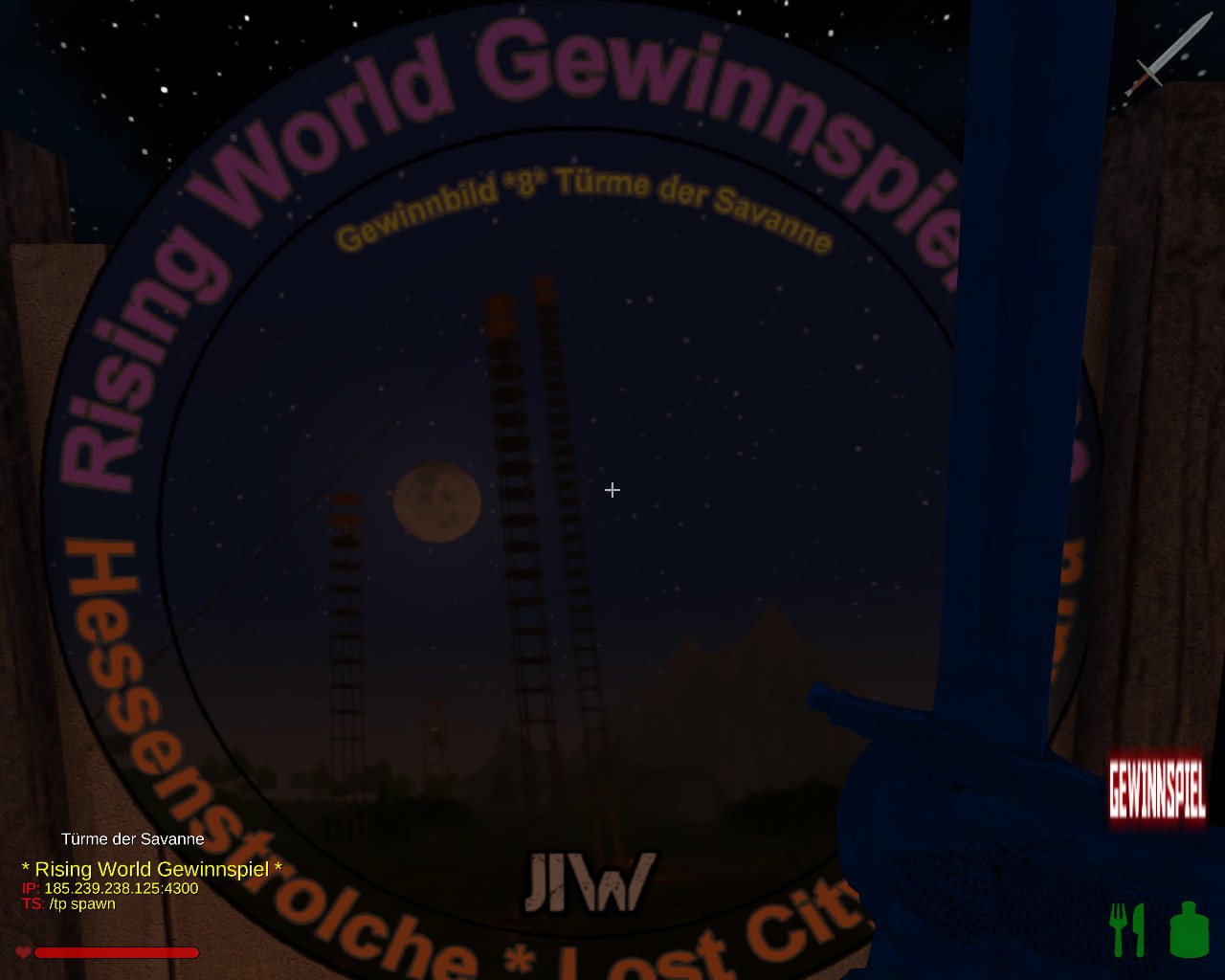 Ihr joint auf den Rising World Gewinnserver, im Journal "J" findet ihr nocheinmal die Regeln zum Spiel. Da PVP und PVE auf dem Server aktiviert ist, solltest Du dir erstmal eine ruhige Position suchen, wo Du vor anderen Spielern und auch wilden Tieren oder gar Banditen geschütz bist. Jetzt kannst du dir nochmal in Ruhe die Regeln durchlesen. Nun gilt es zwei unterschiedliche Bilder vor anderen Spielern zu finden und dann im Forum zu posten. Auf deiner Suche nach den Gebäuden solltest Du auch auf deine Gesundheit was die Nahrung angeht sowie Kleidung wegen der Witterung achten. Hilfreich sind hier die Oberirdischen Dungeons, in diesen kannst du auch Sättel für Reittiere finden um schneller die Bilder zu finden. Wenn Du mal in ein tiefes Loch fällst und nicht mehr raus kommst, kannst du den Teleport benutzen, den Befehl siehst Du unten links. Du befindest dich auf einem recht großem Areal wo wir eine große Mauer gezogen haben. Auf der anderen Seite der Mauer findest Du nichts. Wenn du kein Dungeon findest, brauchst aber einen Sattel, kannst du auch wie es im Spiel üblich ist, dass alles craften, ob dies dann schneller geht weiß keiner. Bitte wundere Dich nicht, wir haben die Taste F3 deaktiviert, damit keiner die Koordinaten verraten kann, aber ein Kompass könnte dir trozdem bei der Suche behilflich sein.