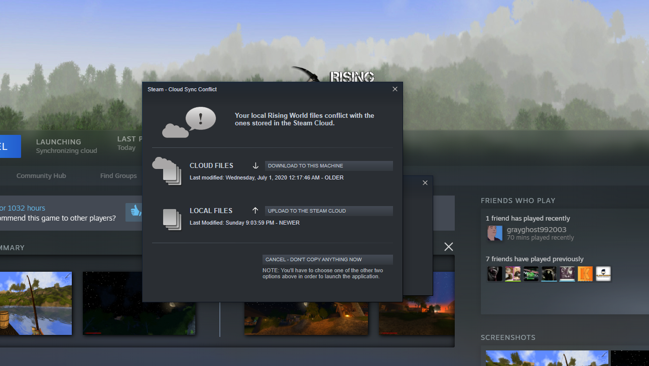 • Hmm... the new version shouldn't be covered by Steam cloud, so this only seems to be related to the files of the Java version :thinking: Do you play Rising World on more than one machine (this usually triggers this message)? Unfortunately I don't know which files are on your local machine and which files are stored in the clouds... if you don't want to lose any worlds, you should manually backup your "Worlds" folder in the game directory (steamapps/commons/RisingWorld/Worlds) and the "Blueprints" folder (if you want to save your blueprints) - then download the cloud files and check out if they are the latest ones.