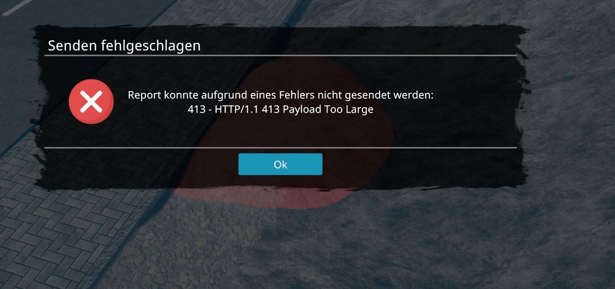 Wie gesagt, das passiert, wenn die aktuell eingestellte Auflösung zu groß ist - damit wird die Größe des Reports insgesamt zu groß. Das können wir leider erst mit dem nächsten Update beheben. Ansonsten kann es kurzfristig helfen, wenn die Auflösung im Spiel kurz temporär heruntergestellt wird, um den Report zu senden (nicht schön, aber wie gesagt, das wird mit dem nächsten Update behoben).