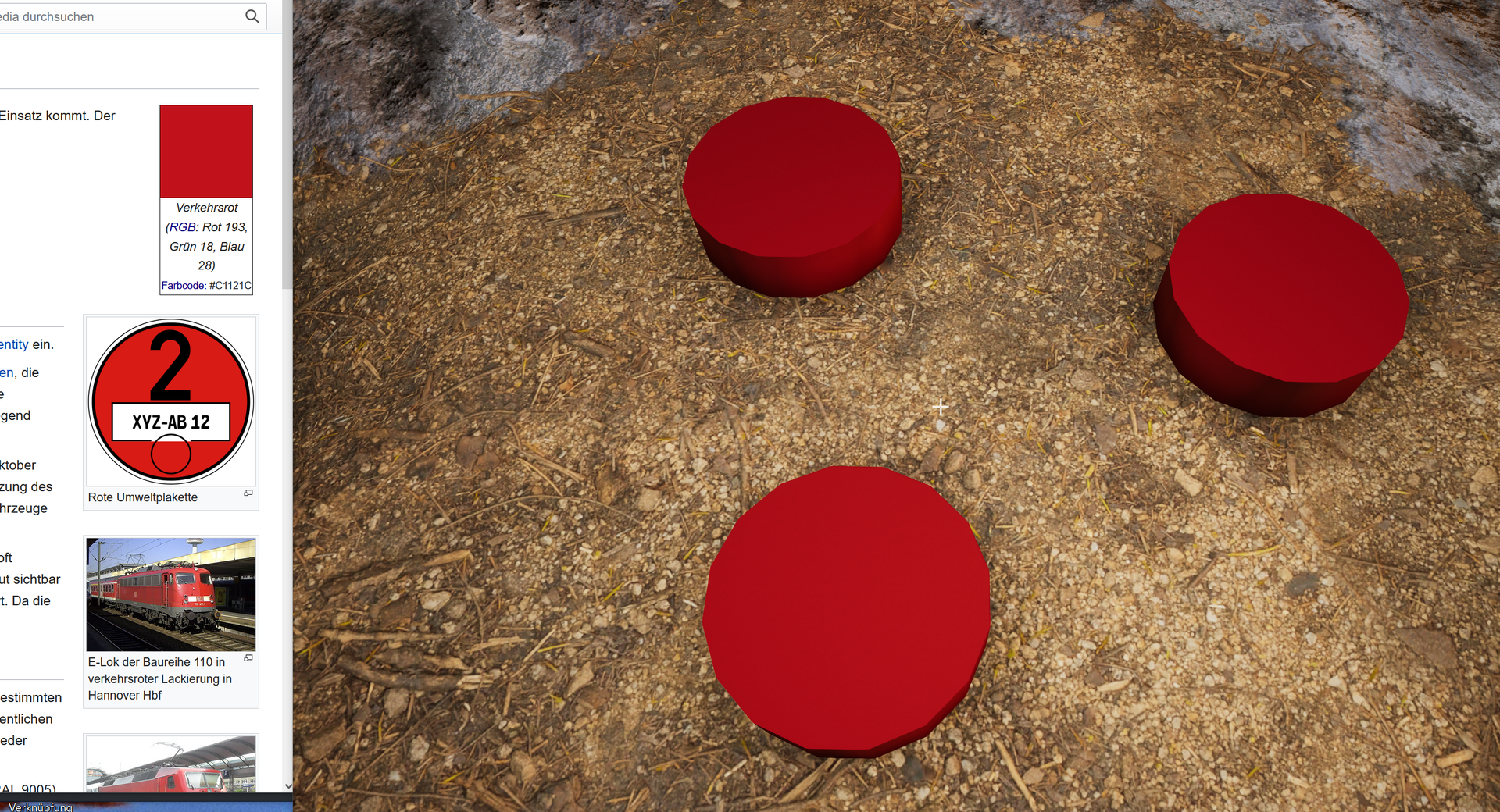 Auf dem Bild seht ihr links die verwendete Verkehrsrot-Farbe und rechts die Farbe aus Rising World. Ich denke, sie ist sehr ähnlich. Ich war bemüht den standard Rotton #800000 zu erreichen,