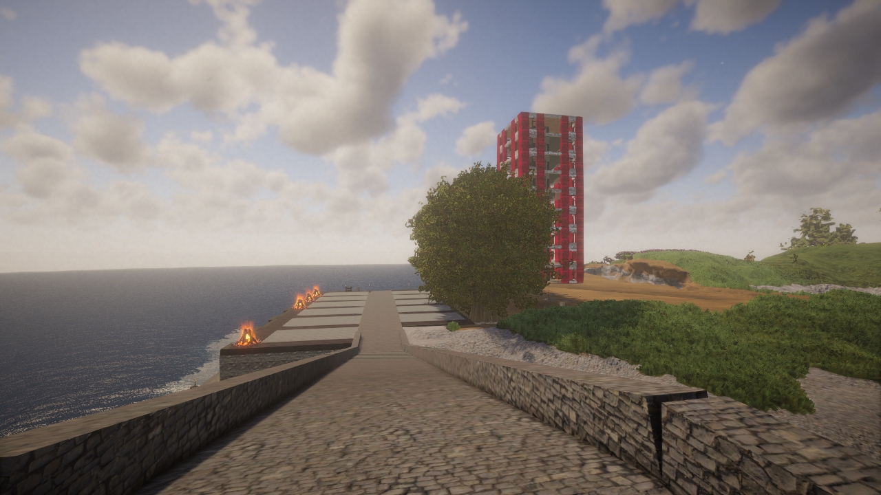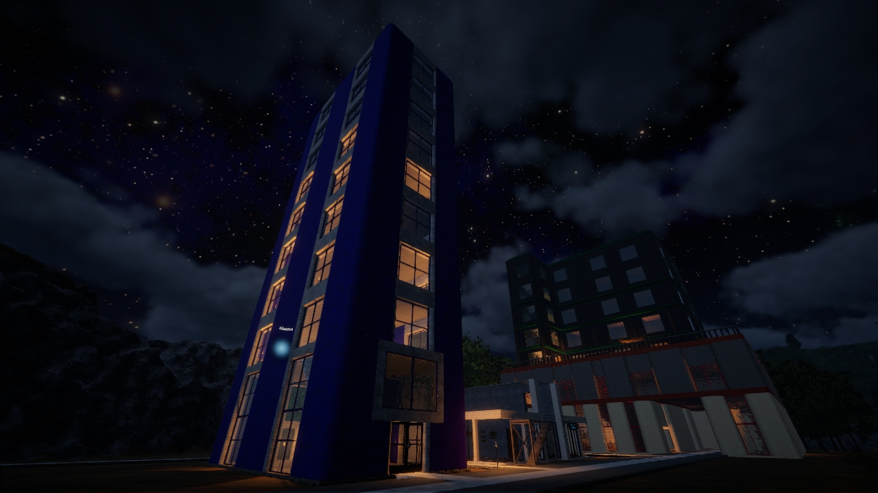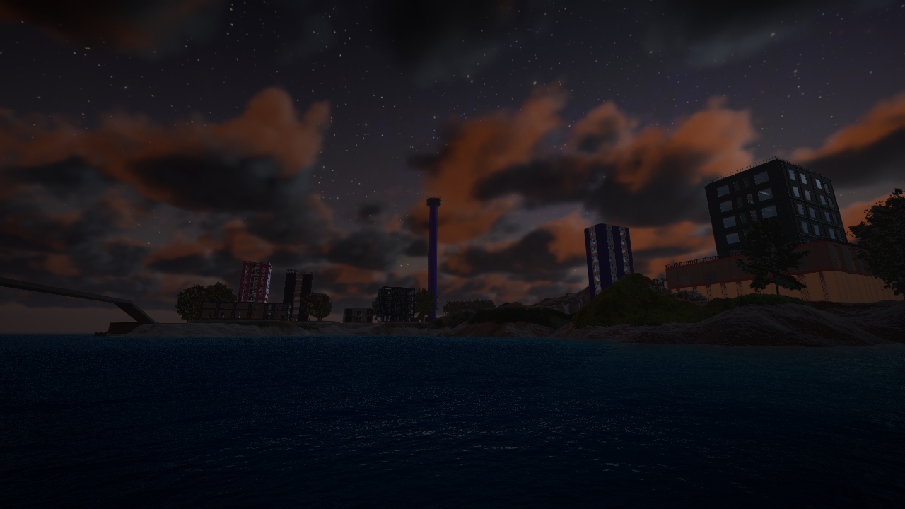 With 'Port Vilipec' on one side, we have a more urban settlement on the other side named Vathunver. One is rural themed, the other is urban themed, both a part of the same bay. Both are connected by a bridge (as noted in below image), which leads to Vathunver's port large enough for future boats. It can handle many small boats to a few big ones. While Port VIlipec handles small boats, Vathunver can handle big boats. The first building to great you, other than the port, would be the 'Canadian Tower', still WIP. It has window frames, just not glass. Its missing middle portions, furnashings, etc.