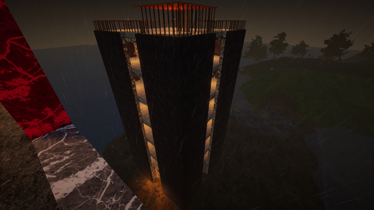 This 8 floor tall tower is dedicated to hemp, cotton, and cloth functions. It shall handle hemp (eventually cotton), while also eventually holding and handling future player character clothing stuff, hence the 8 floors to process and handle everything. Even furniture. Windows shall be added at a later date thanks to the train tax I have enacted. Glass currently requires iron, I need that iron for trains later.