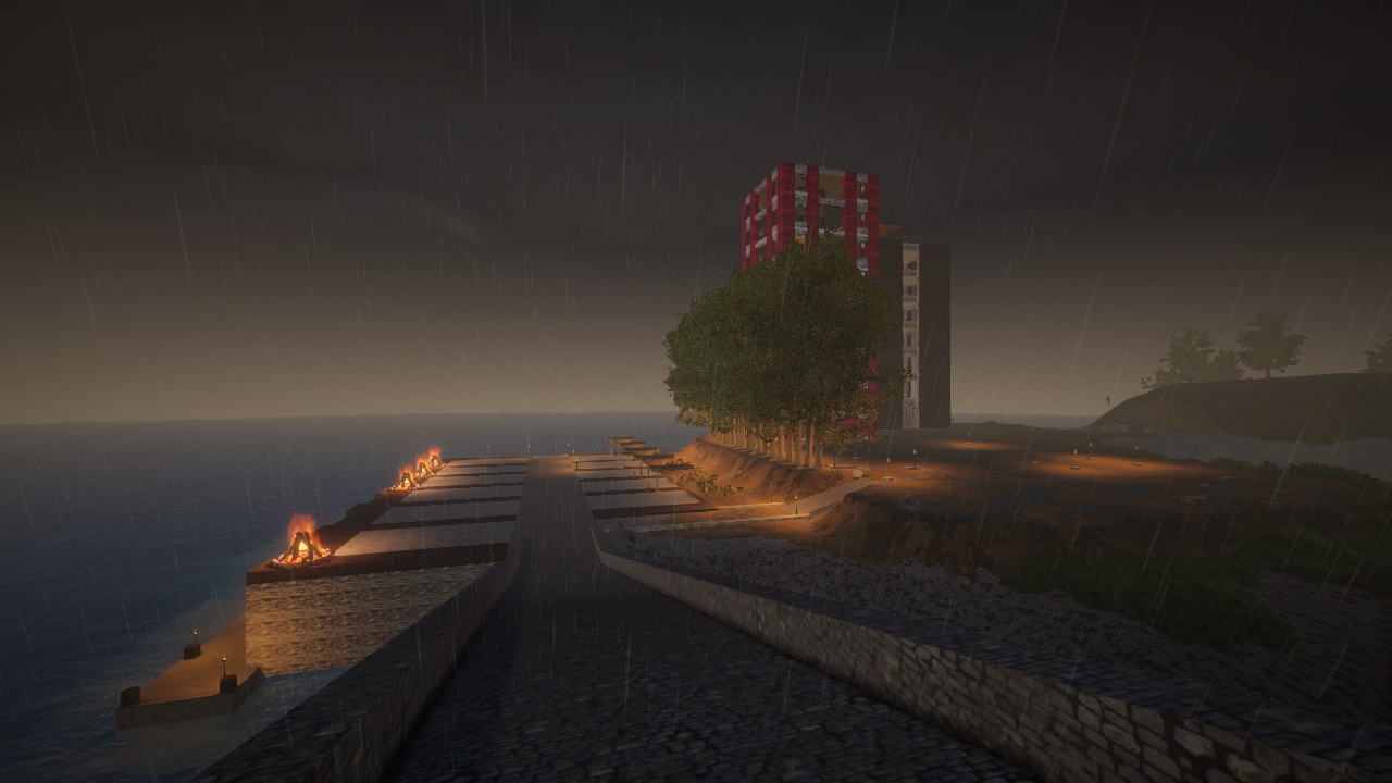 Found a lovely "inlet" allowing for proper protection of boats. Good place to shelter up, build up, and to set up a trading area. As noted, took me a few hours and days to start construction, finally founding my 'Harbour City' (TBD) to allow for smaller and bigger boat traffic. Started off with a main road, a harbour lining, and even placing my home first. My home may be "simple and boring", it however is functional, or should be. Gotta start somewhere. I scouted out the terrain to find the 'medium' height range between high and low, painstakingly flattening the area. Doing this, I even fiddled with blocks finding out (through a guide on Steam) that 'C' gives me more building controls. I still decided to stick to the default grid giving it a more "European" built vibe.