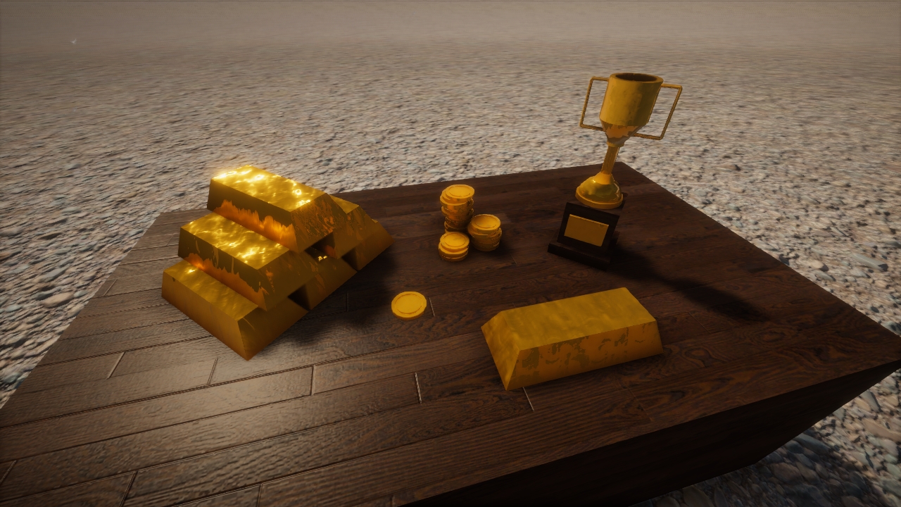 gold ingots, coins, and trophy
