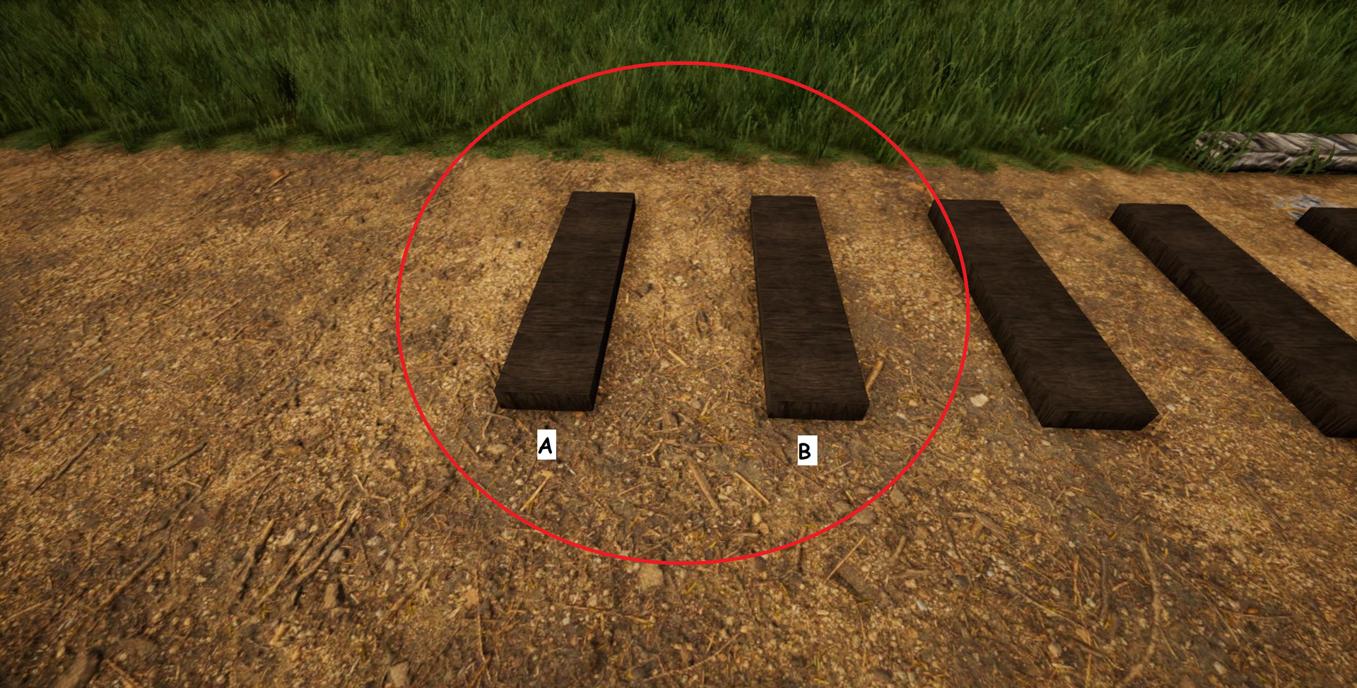 • Das passiert wenn "Modulares Andocken" aktiv ist und ich mir eine Blockgröße über die "EINFG"-Taste hole. Wie auf dem Bild zu sehen habe ich eine Gleisschwelle platziert und die nächste hat sich von alleine um 90° gedreht. Die Rotation ist allerdings 0 0 0. Die Schwelle auf dem Bild "B" die ich zuerst platziert habe hatte die Maße 0.7 x 0.8 x 3. Damit ich die fehlerhafte Schwelle (ohne Rotation) wieder richtig platzieren kann muss ich die Größe auf 3 x 0.8 x 0.7 setzen "A".