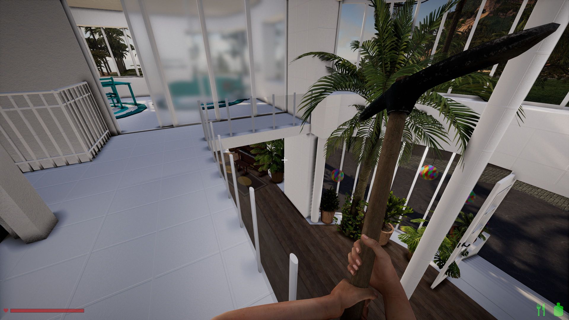 • Ich kann, wie auf meinem Screenshot zu sehen ist, durch die matten Glasscheiben nur Umrisse erkennen, allerdings wird durch das Geländer alles sichtbar.
