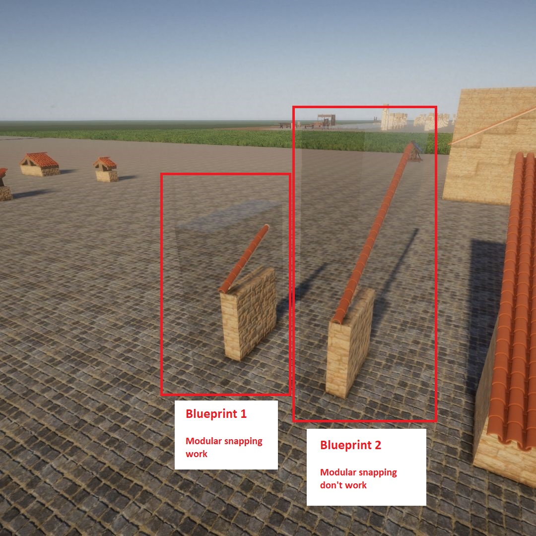 A little more context about what I try do do. I want to make an upgrade for my roman roof tileset, with more rounded roof, in fact a half hexagonal roof (top view) maybe for a tower or a church apse. To do that, I use temporary blueprint (like the ones on the image) to do some part of the final structure. In the following example, the blueprints are destined to be the hips of this roof module, and "blueprint 1" is a work around to replace the non functional "blueprint 2". But it's not the only case I make a blueprint without a functional modular snapping. The issue seems totally random, and I want to understand the logic under the problem to get that more predictable.