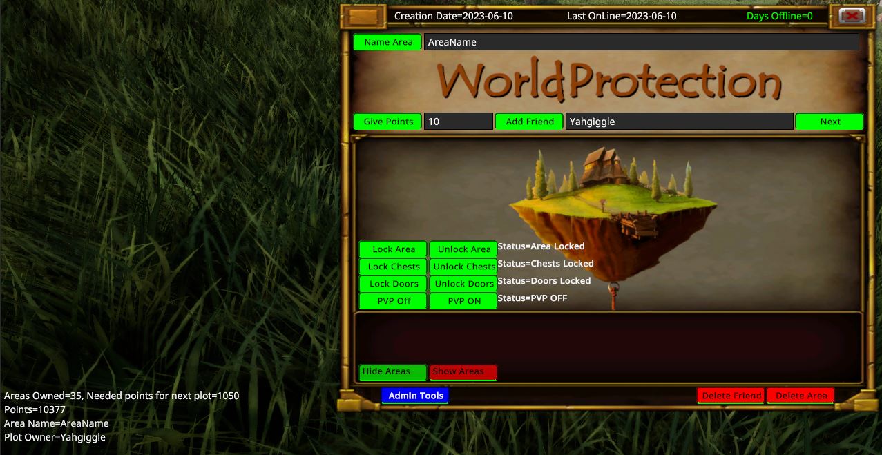 - Added Player tools Players can now set permissions for each area they own, to set permissions stand inside the area you want to change its permissions for, then hit the b key and click open panel, click player tools and toggle each permission on or off.