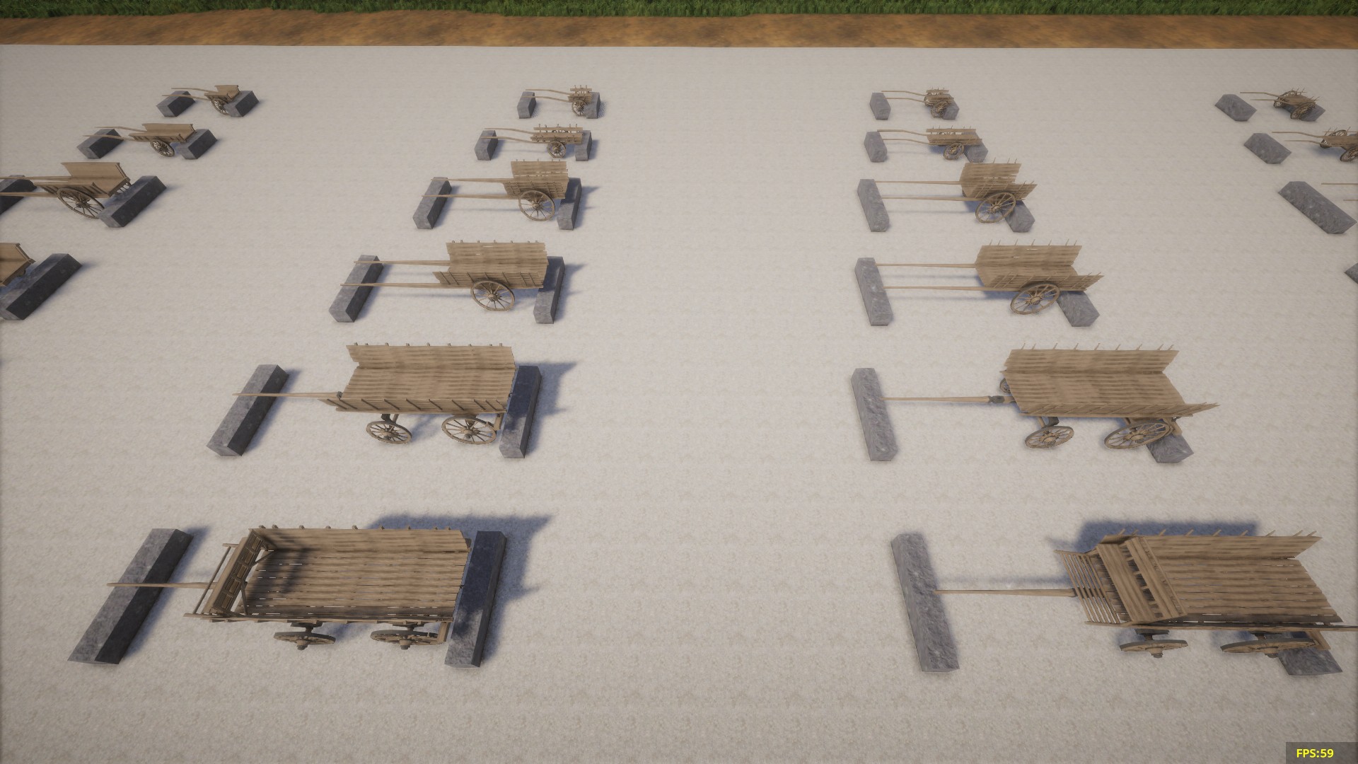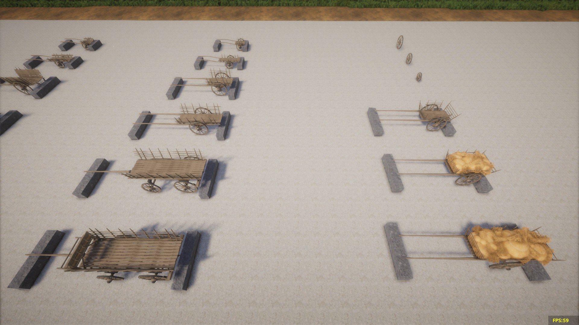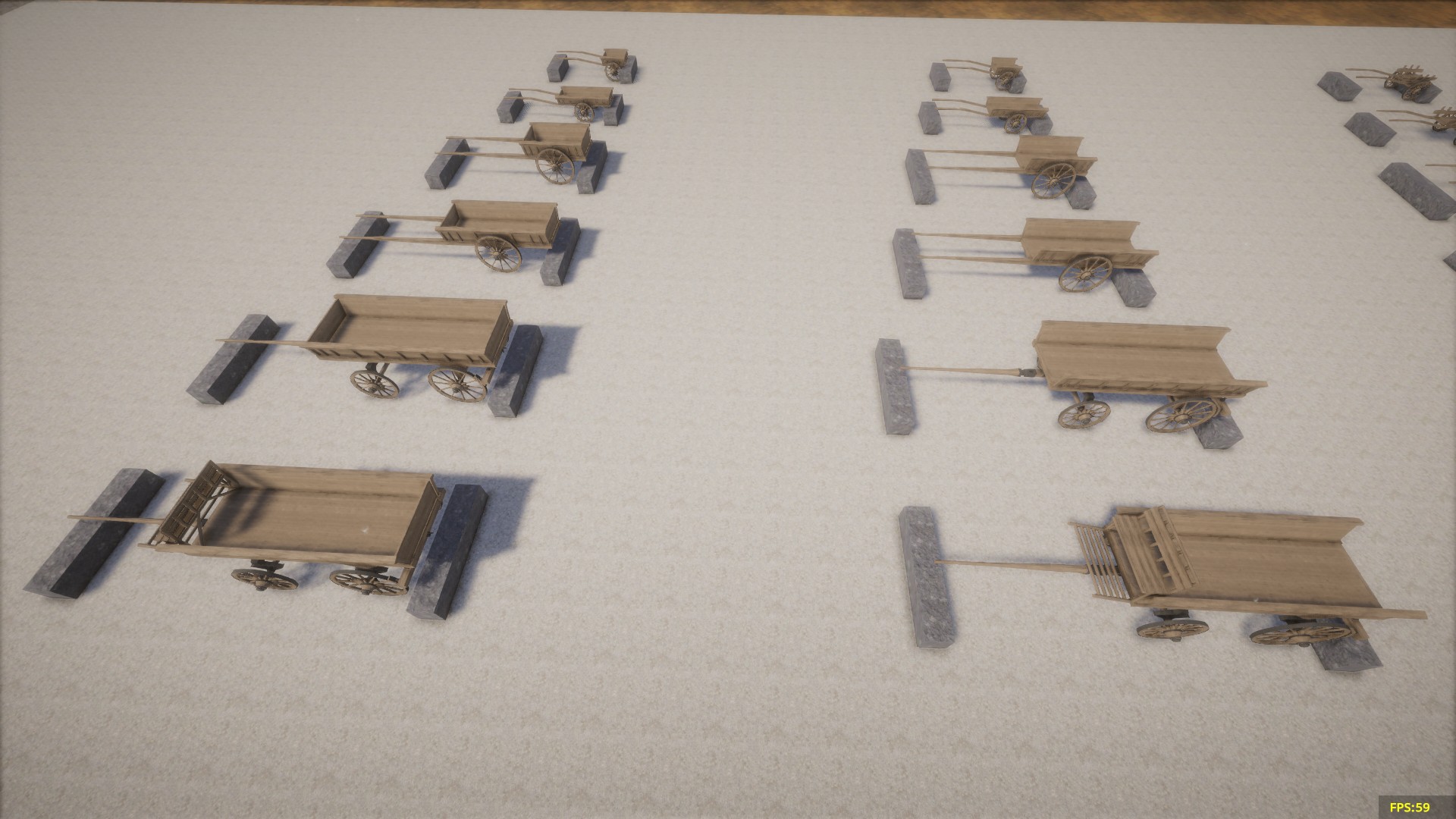 It’s a set of old wood carts of different size and shape for preindustrial worlds. Most are designed to be used with horses or others draft animals (bullock, donkey, horses...). Of course, its only static objects for scenery at the moment, but that can eventually evolve if the game allows it someday.