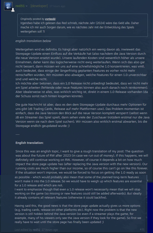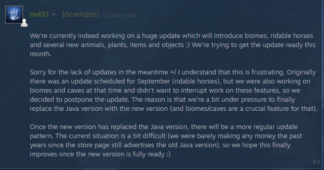 My god, Rising World is seeing difficulties. Sure, Rising World shall update going forward, maybe slowly. I'm sure Rising World shall do better with each update, but someone has to help me out with other people's requests, (as well as my own) requests to which it also helps out Rising World in return. Less idling, more helping. I'm doing all I can on my end as well between other stuff. I'm trying to get people on board on Rising World, they however sadly view it as a 'niche' game.