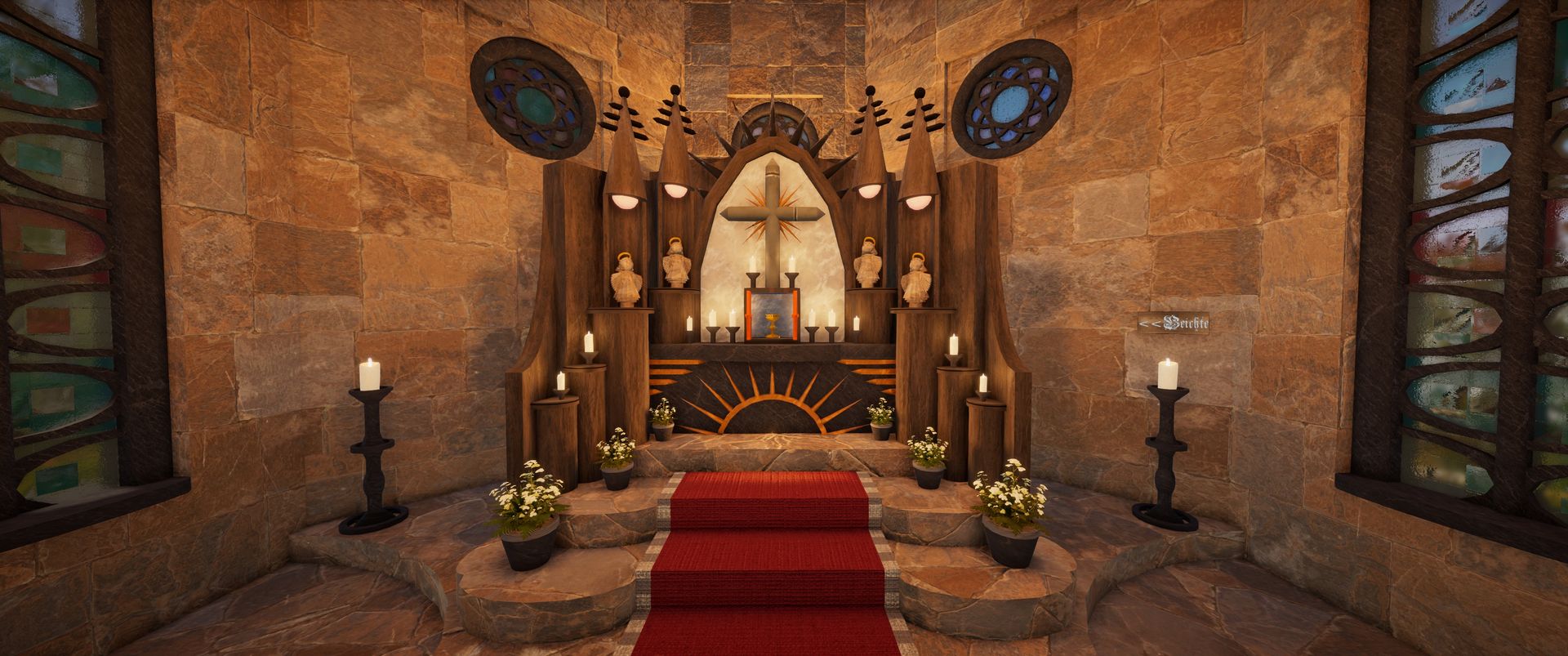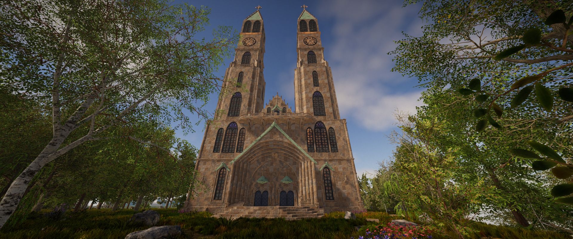 the last 3 weeks I have been building a church. The blueprint is without plants and terrain, but empty flower pots to fill are already partly built in. The structure is a bit bigger and has about 120,000 components and 673 objects. Because I also attach importance to the illumination at night, many lamps are built in. The tower is walkable, bells are installed, even if the big bell is probably a tad too big because of the swing angle