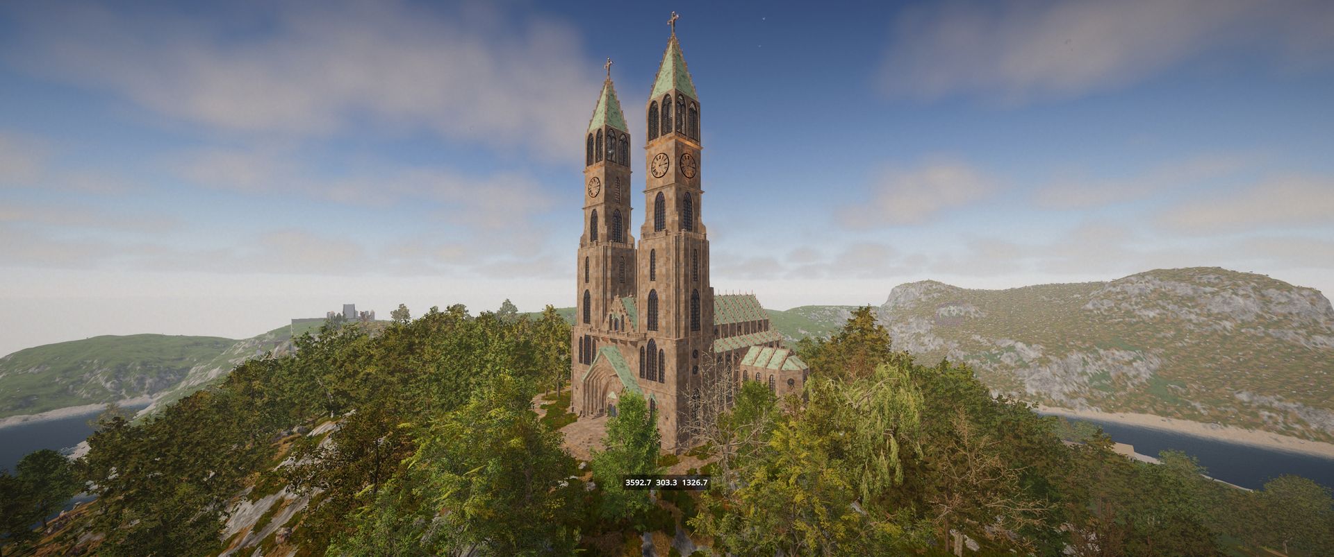the last 3 weeks I have been building a church. The blueprint is without plants and terrain, but empty flower pots to fill are already partly built in. The structure is a bit bigger and has about 120,000 components and 673 objects. Because I also attach importance to the illumination at night, many lamps are built in. The tower is walkable, bells are installed, even if the big bell is probably a tad too big because of the swing angle