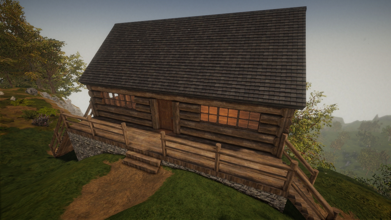 my first proper house in the new version! just a simple single-room log cabin. i intend to rework and expand upon it at some point (add fireplaces, rework the windows/walls so i can add room partitions, maybe add a loft, etc), but i think it's quite useable in its current state and i'm happy to show it off. special note; the flat interior walls can be edited/painted separately from the exterior log siding! and while it's built on a hill originally, it wouldn't take much to tweak it for a flatter space.
