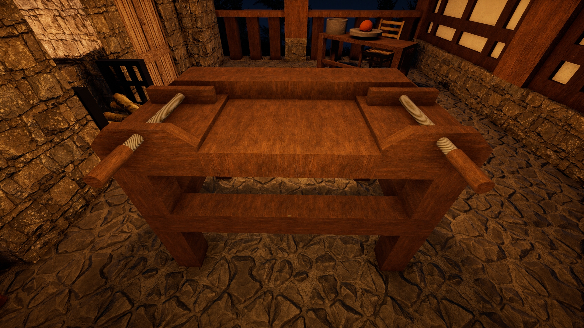 If you scale the window frames to 1.0 x 1.4 x .2 and place them on the ground standing up next to the bench it looks like forms for making different clay tiles, bricks, etc.