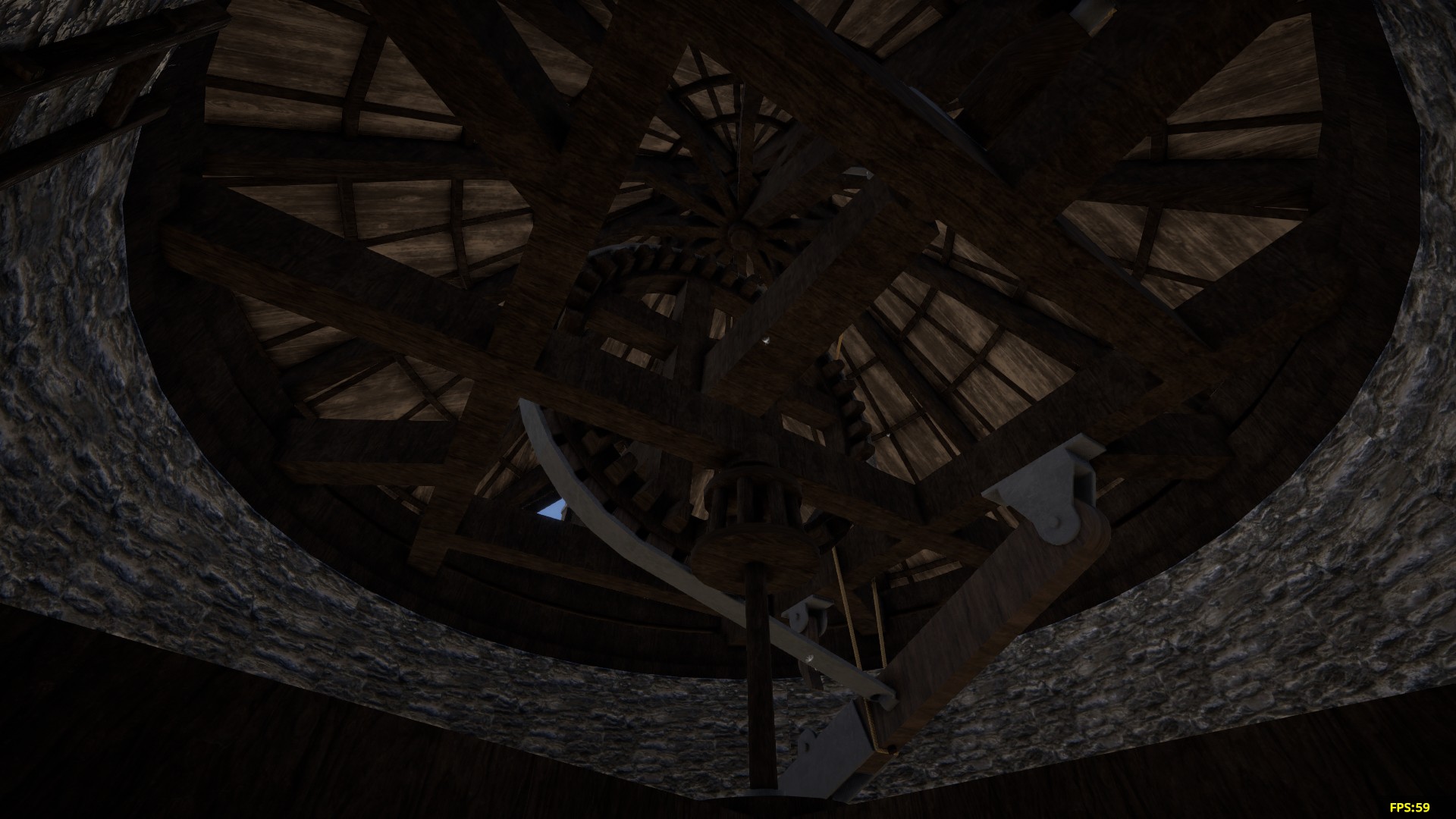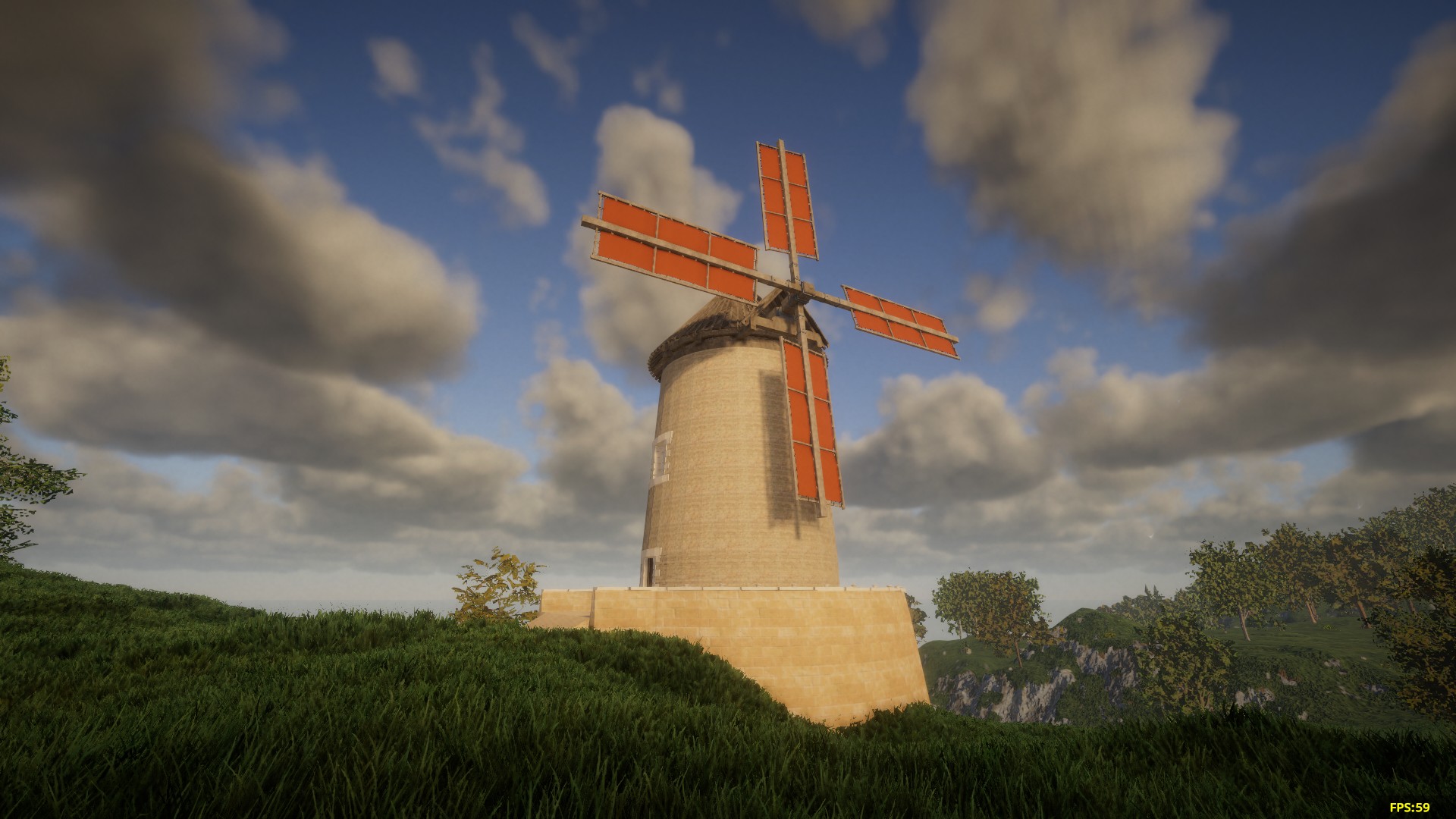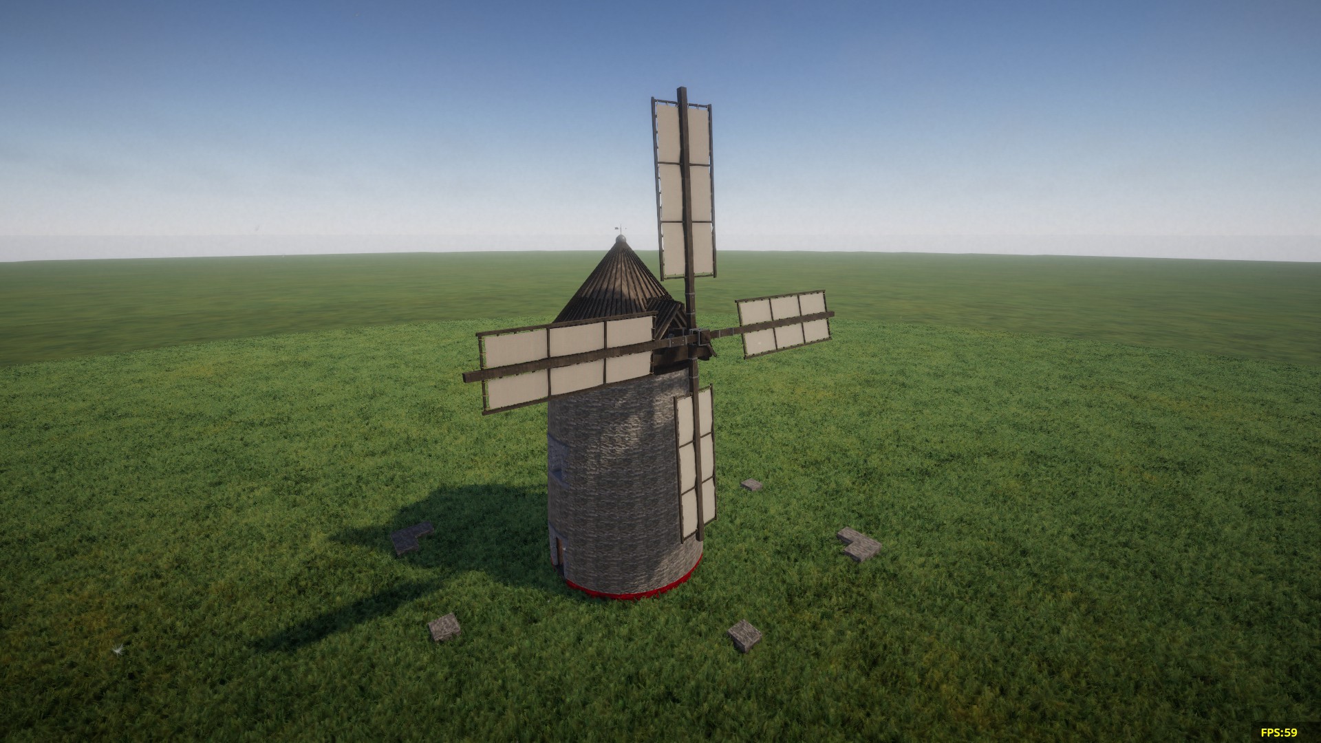 This tower windmill is a lightly modified version of one I have build on Medieval realms server (coord: 6850 4350). Its aligned to the grid. The red base is here to spot the floor level when you place it, and should be erased after. You should place the grinder yourself at the obvious place.