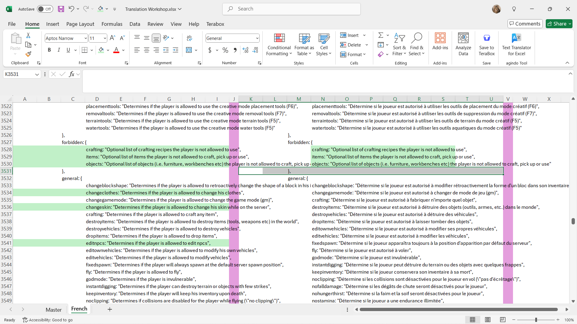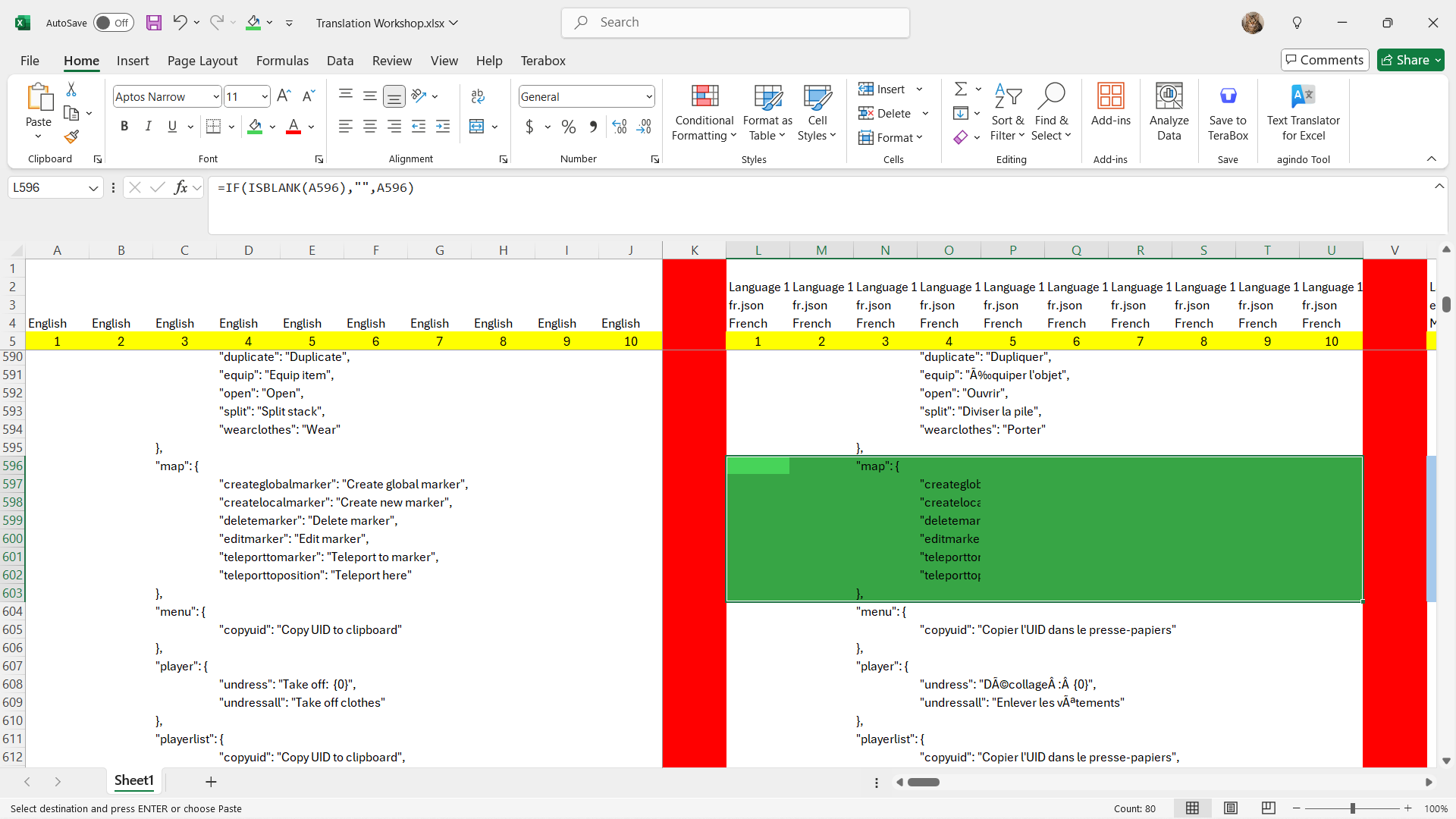After doing the excel side of the translation. I then copy the French translation from Column K going right and create the new text file which will feed into BabelEdit.