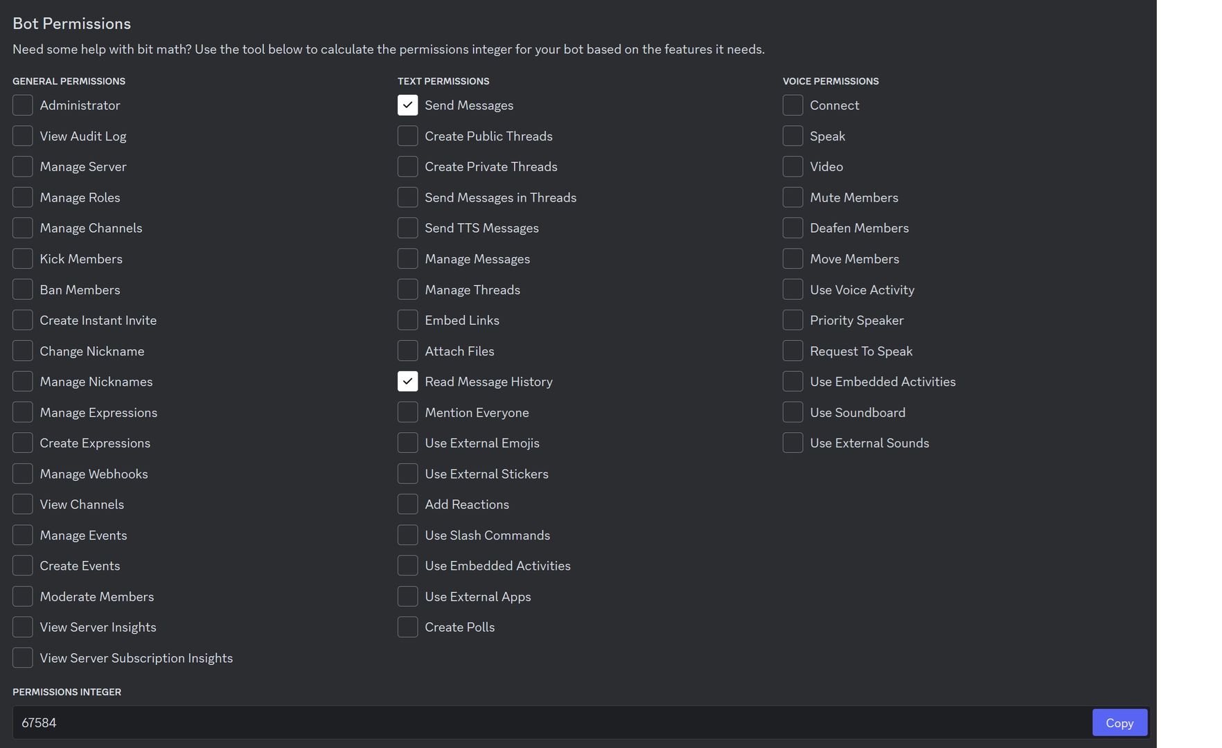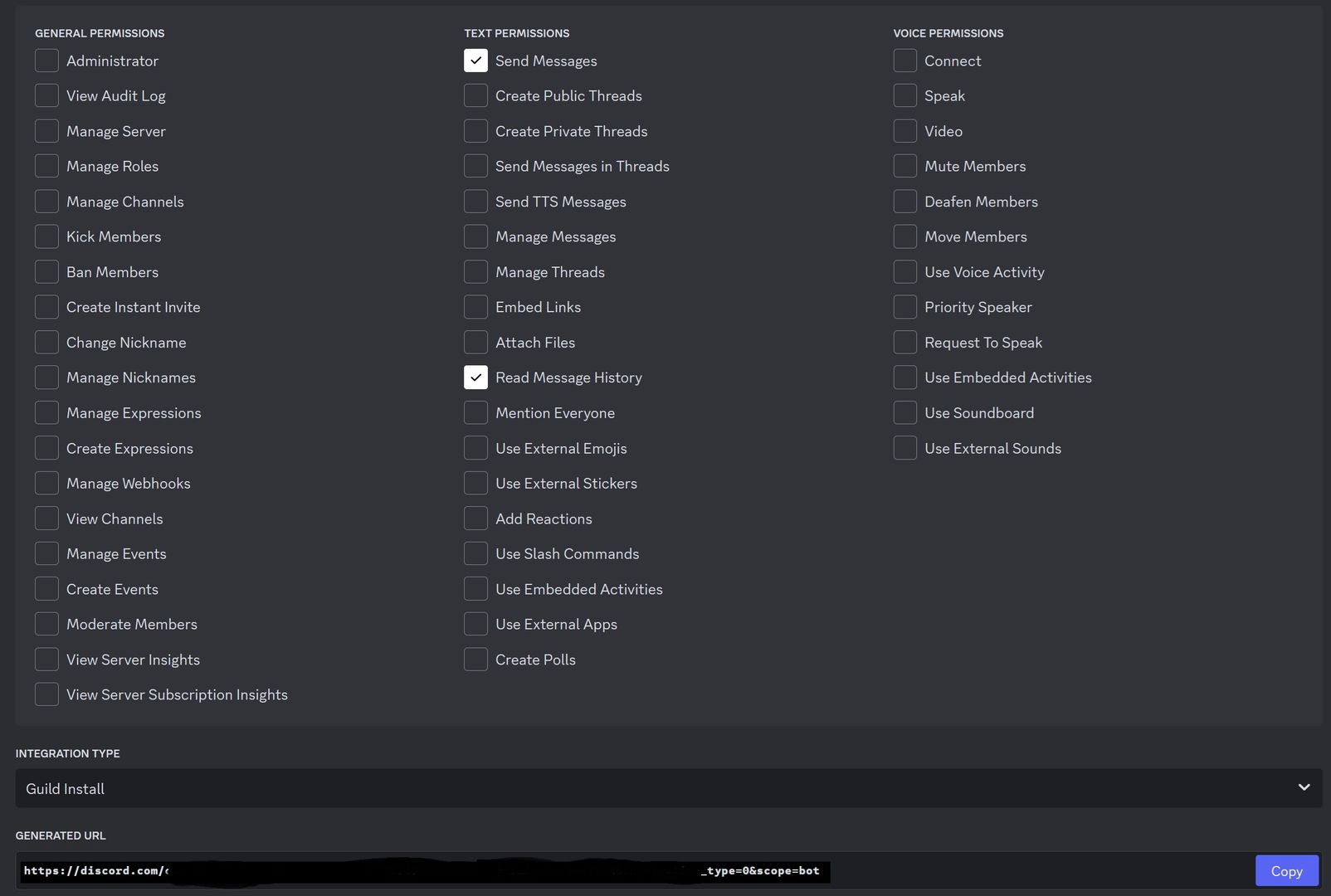 leave integration type alone and and copy the generated url(save this for later as its used to add the bot to the discord server!).