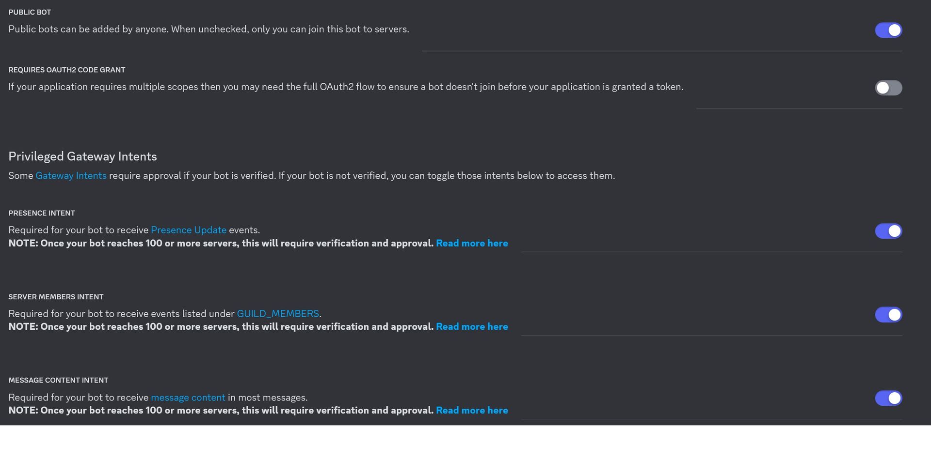 under auth flow select public bot, presence intent, server members intent and message content intent.