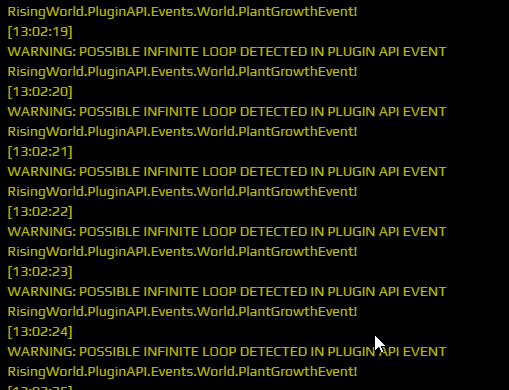 • Sorry für die späte Rückmeldung! Bei den Warnmeldungen handelt es sich leider um einen Bug :/ Wir haben mit dem letzten Update eine Überprüfung eingebaut, womit das Spiel prüft, ob ein Plugin-Event evtl. nicht mehr beendet wird (zB ein Plugin eine Endlosschleife triggert)... leider gibt es aber einen Bug, wodurch Events, die von Plugins nicht verwendet werden, genau diese Meldung auslösen (was gar nicht stimmt).