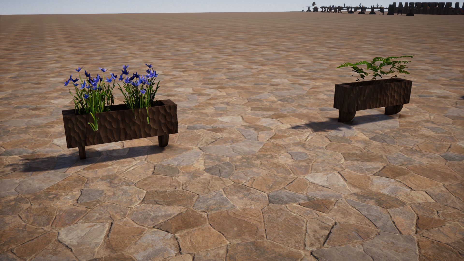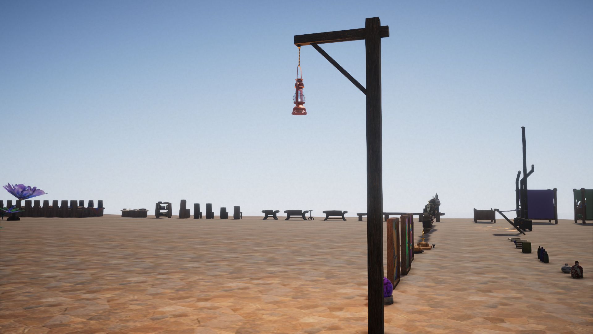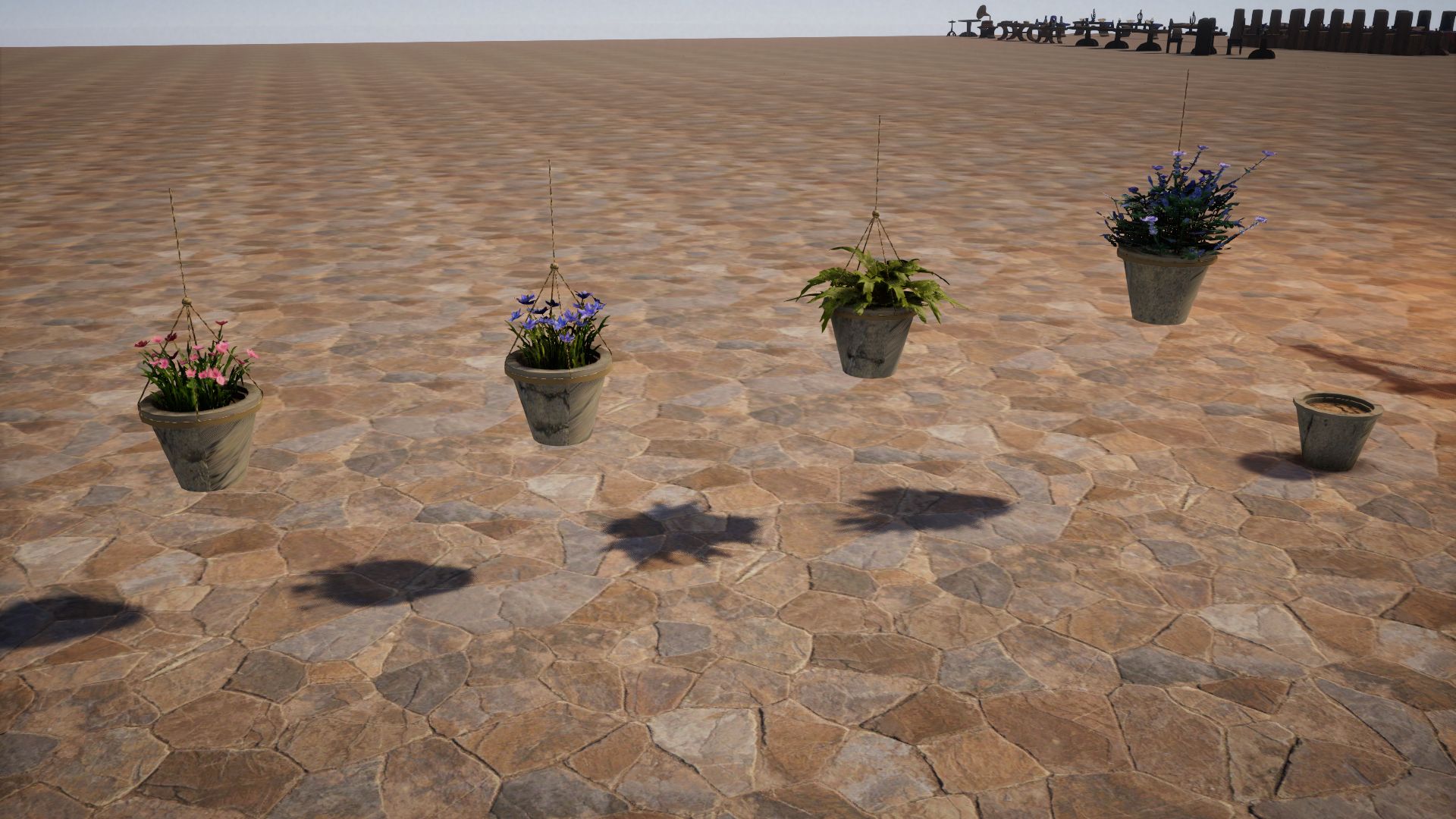 Most of these are indoor, so lets begin with the few outdoor fixtures, like this cloth window awning, wood flower boxes and hanging clay flower pots (one non-hanging pot included with no plant). As well as a free standing lamp post.