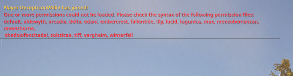 "One Or More Permissions Could Not Be Loaded. Please Check The Syntax Of The Following Permission Files:" then lists EVERY .json file I have in my servers "groups" folder.