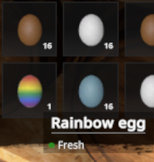Out of curiosity, though, what are the odds that one of the eggs will be a rainbow egg? With four barrels full of eggs, the chickens have only laid one rainbow egg, so they must be very rare.