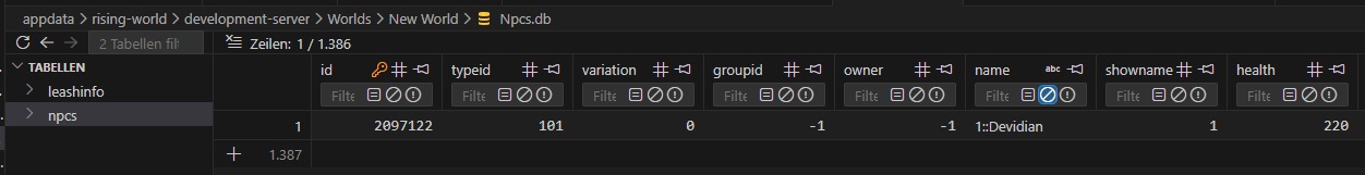 I just looked up the npc database with my vscode sqlite viewer plugin.