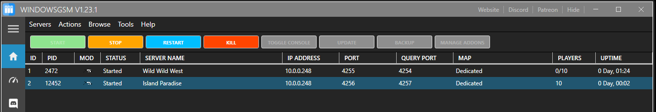 Hello! I am using the WindowsGSM game server for two multiplayer servers. Both servers show up under the multiplayer section of the game and I can connect to "Island Paradise" but not "Wild Wild West". NOT at the same time, but when I stop Island Paradise, I can then connect to Wild Wild West. I googled how to host two severs of Rising World on WGSM and it told me to use 4255 and 4254 for one and 4256 and 4257 for the second. The IP is the same so would that be the problem?