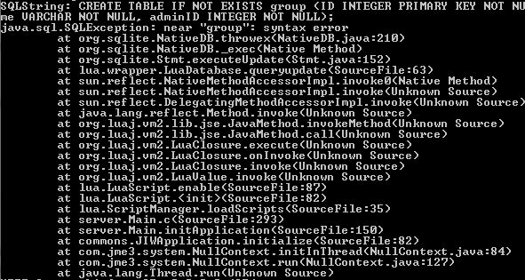 database:queryupdate("CREATE TABLE IF NOT EXISTS 'group' (ID INTEGER PRIMARY KEY NOT NULL, name VARCHAR NOT NULL, adminID INTEGER NOT NULL);");