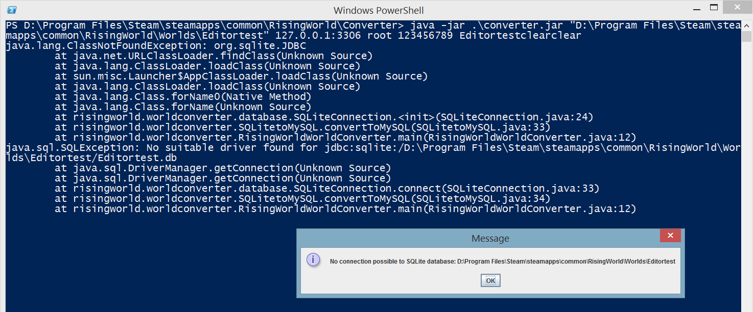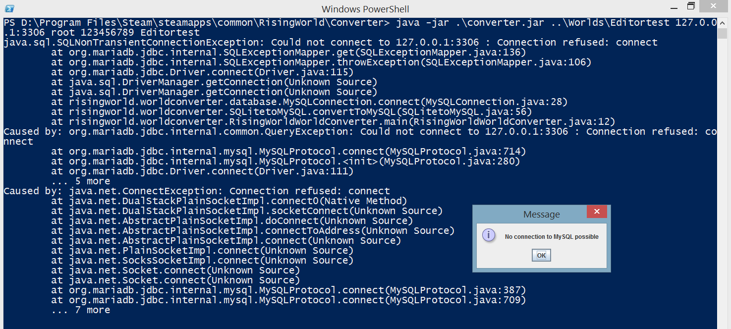 2) run java -jar ./converter.jar "D:\Program Files\Steam\steamapps\common\RisingWorld\Worlds\Editortest" 127.0.0.1:3306 root 123456789 Editortest