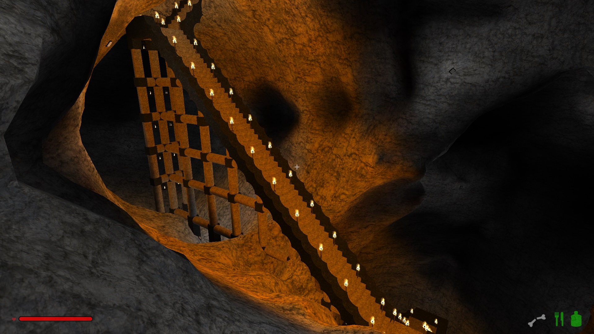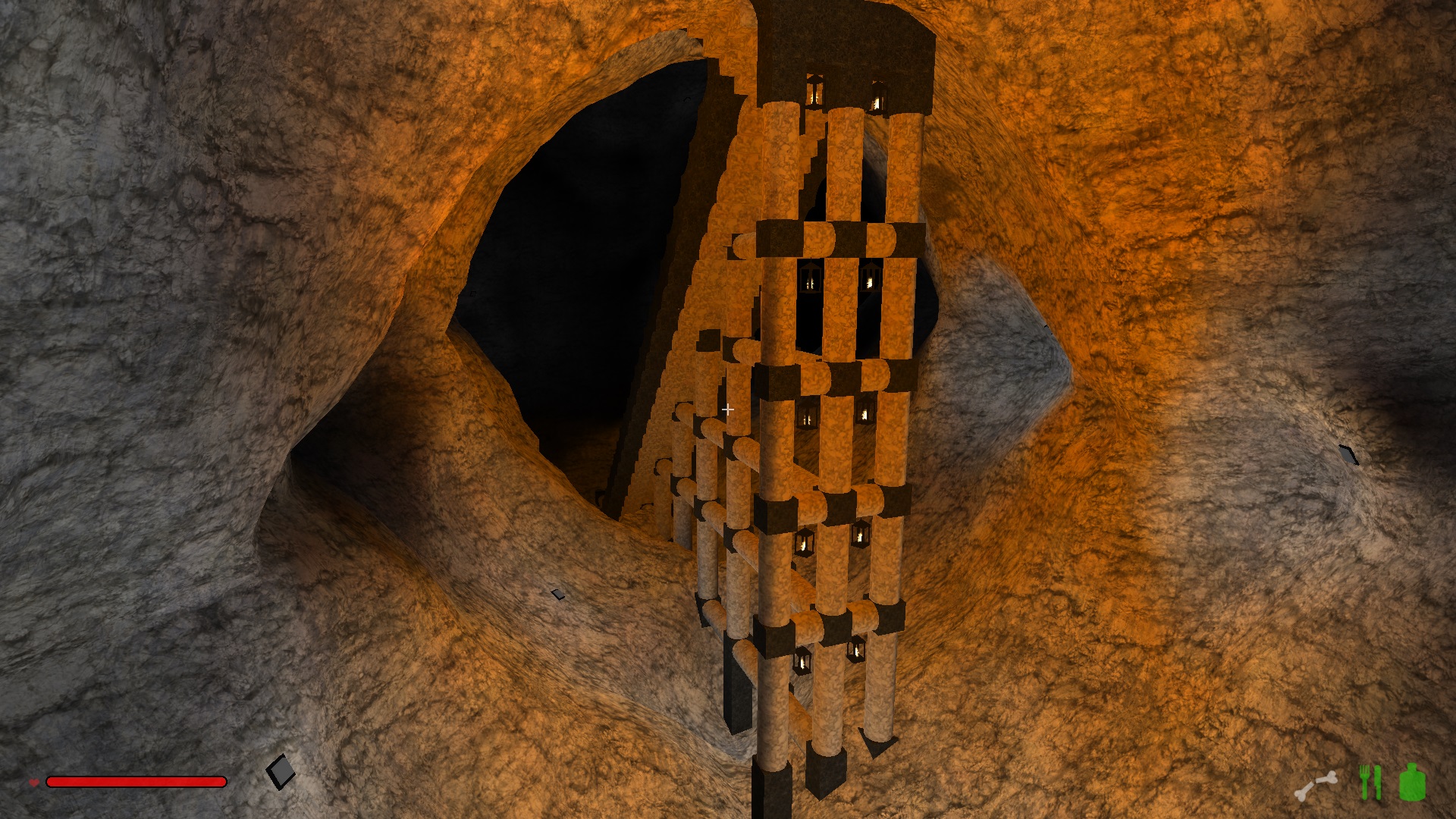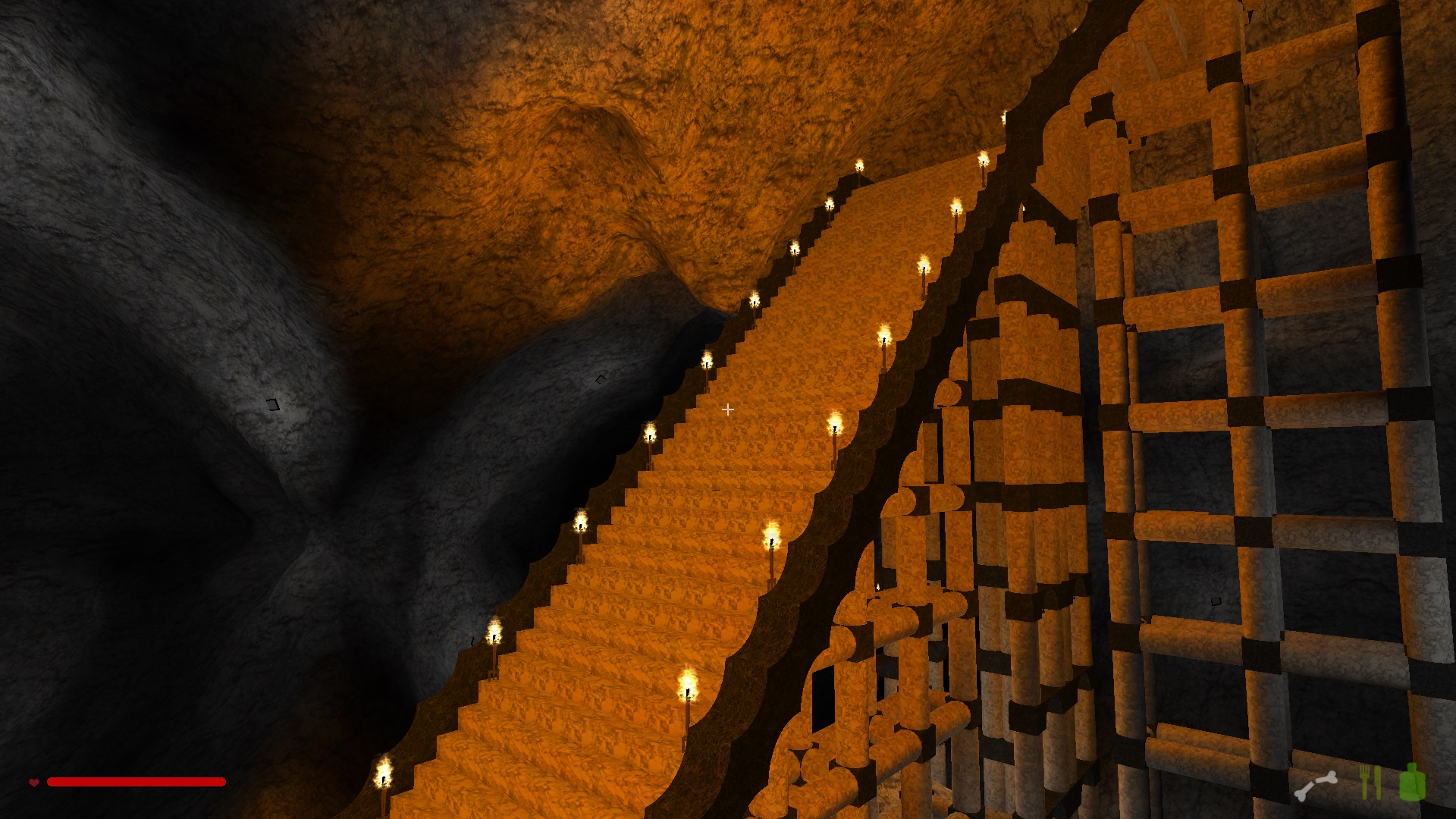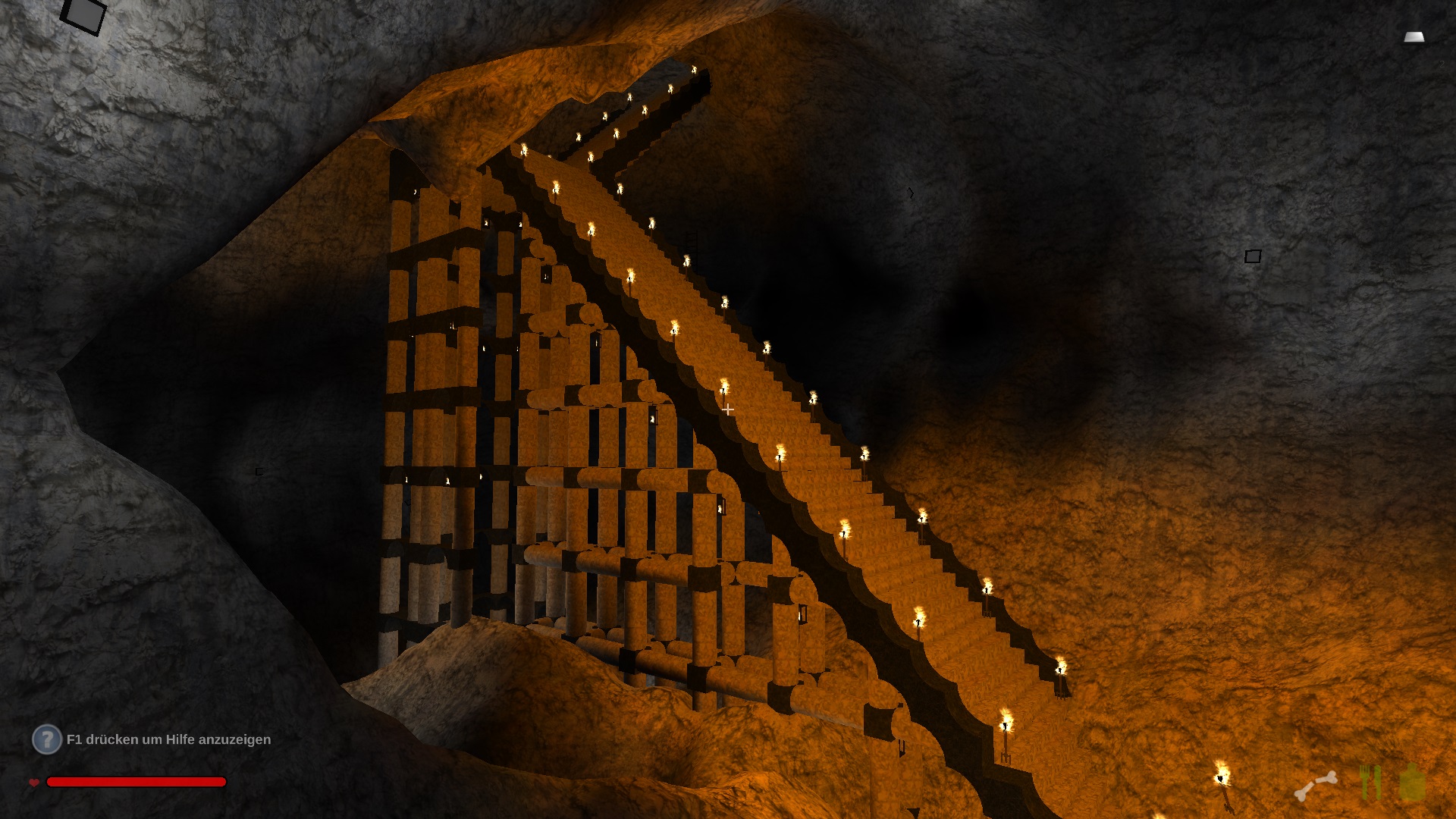Im oberen Drittel hab ich mich noch ganz herkömlich einfach durch den Fels gehauen und ab der ersten Kaverne bin ich dazu übergegangen Treppen zu bauen, weil die einfach schneller nach unten führen.