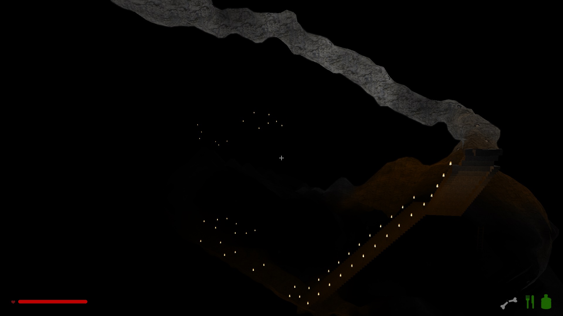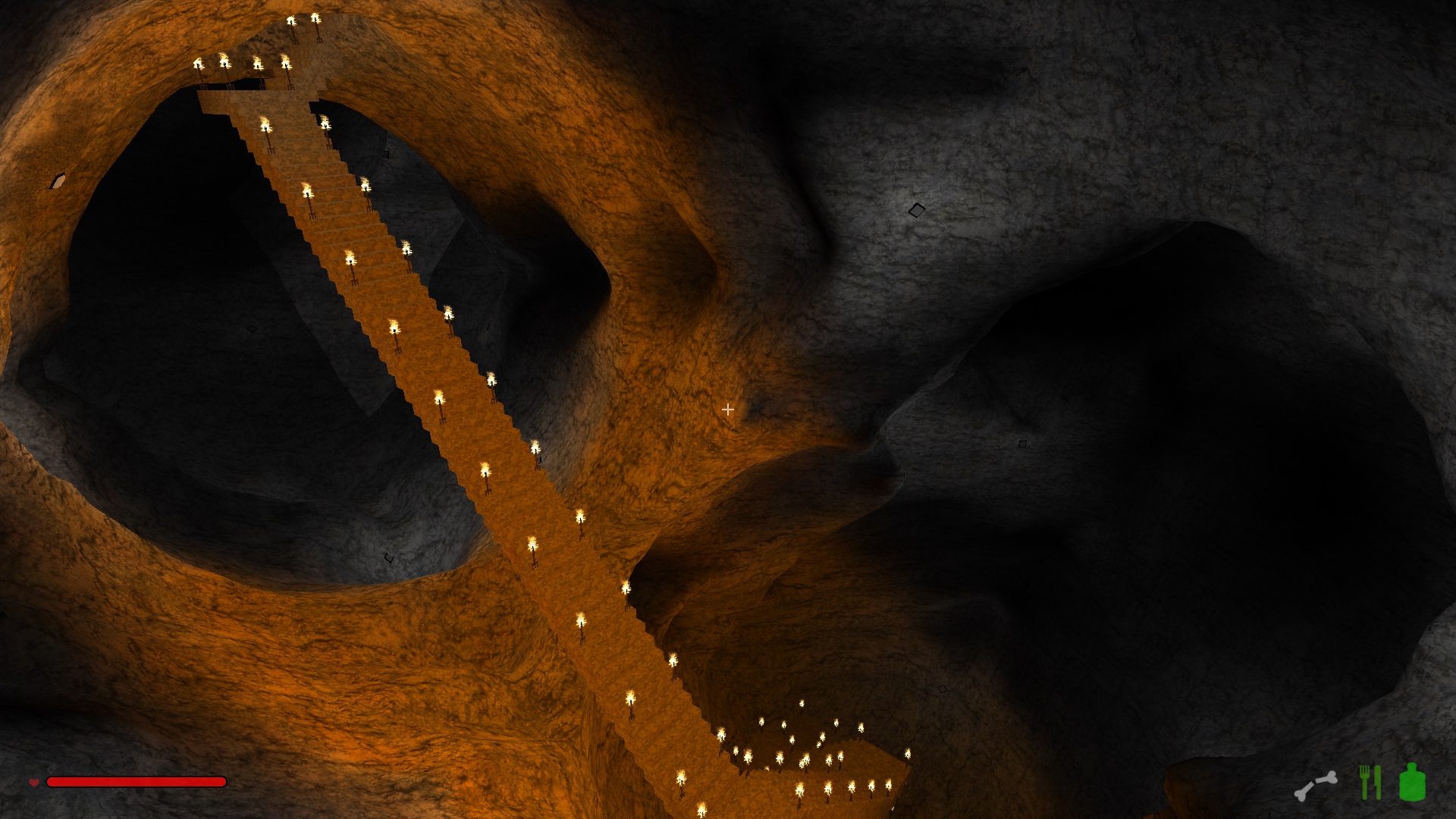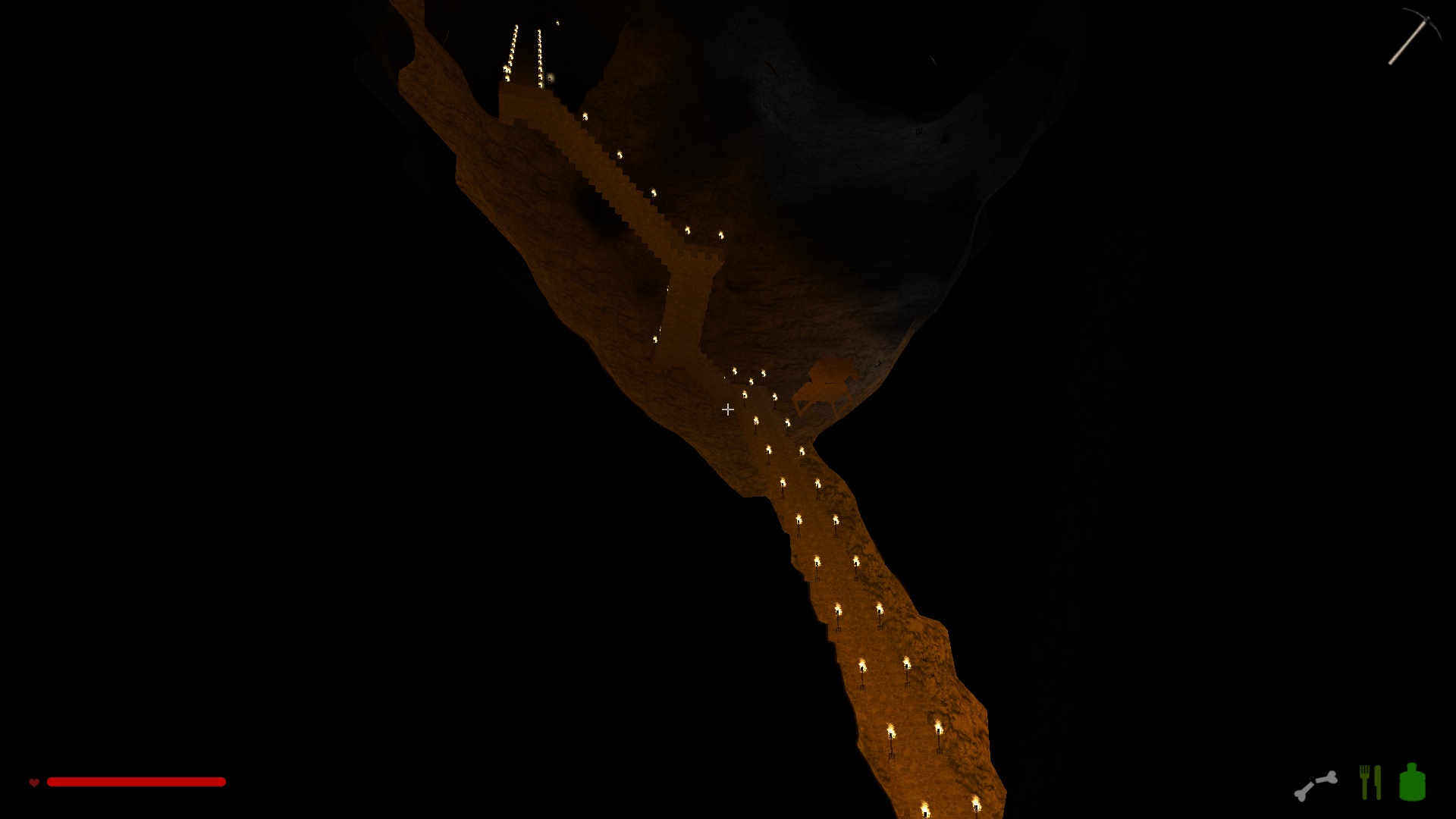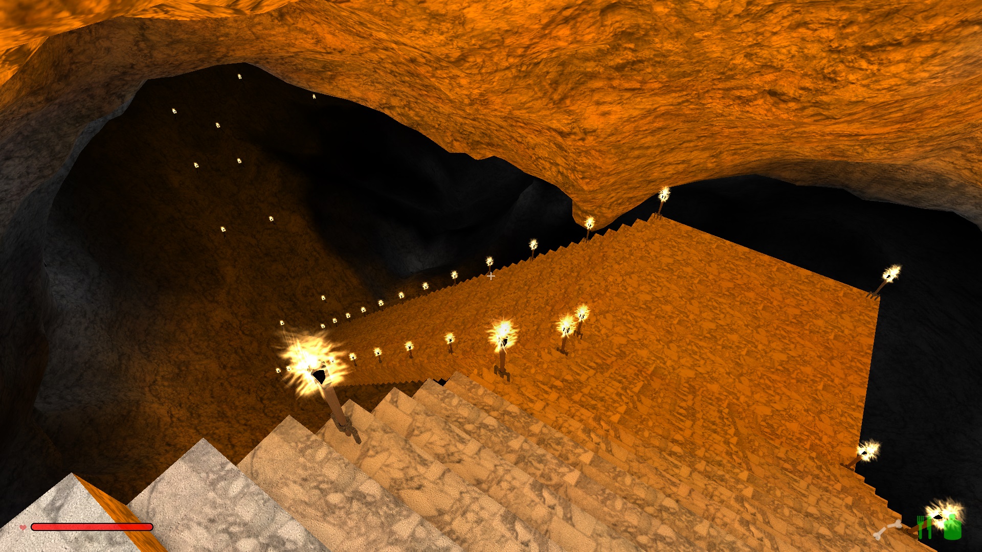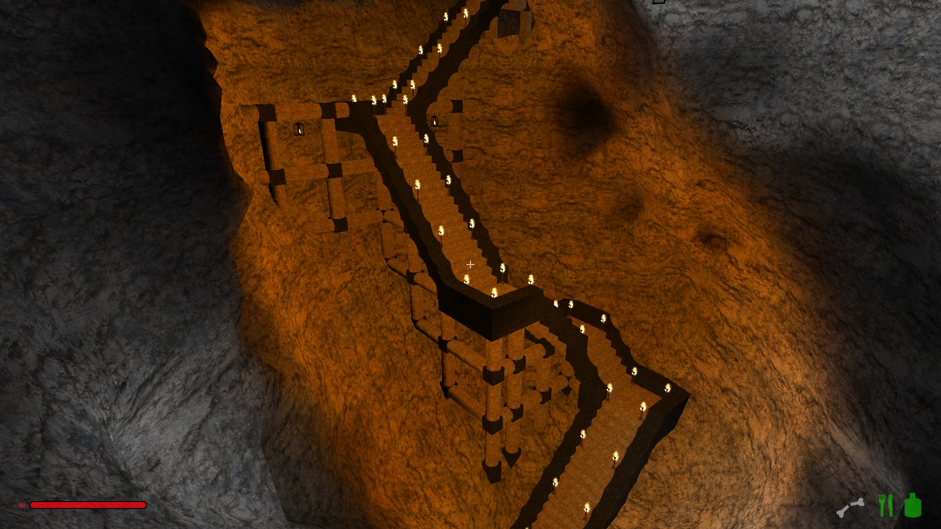 Im oberen Drittel hab ich mich noch ganz herkömlich einfach durch den Fels gehauen und ab der ersten Kaverne bin ich dazu übergegangen Treppen zu bauen, weil die einfach schneller nach unten führen.