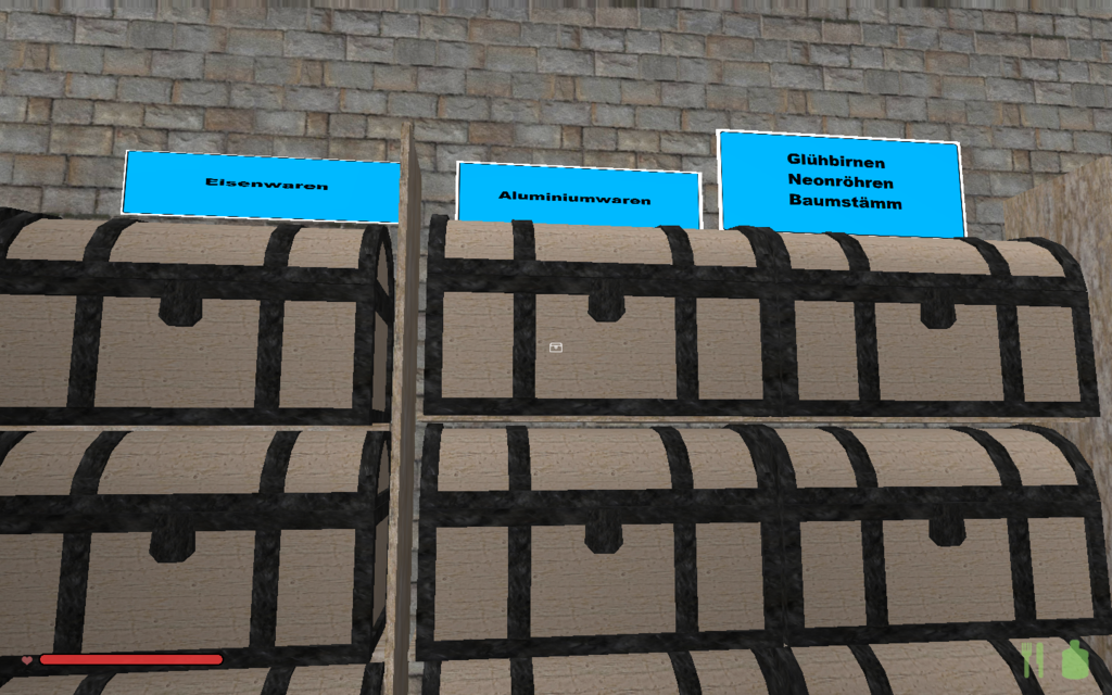 bei den kisten habe ich mir ohne beschriftung geholfen ich habe ja einige an auswahl die fabrlich und vom äusseren variieren , habe dann im prinzip eine sorte kiste für ein material festgelegt. zb für früchte die helle kiste mit den grauen beschlägen, für eisenteile die ganz dunkle mit den schwarzen beschlägen, lampen als eselsbrücke schwarz/ weisse truhe, für die steine und erde zb die marmorierten oberflächen .