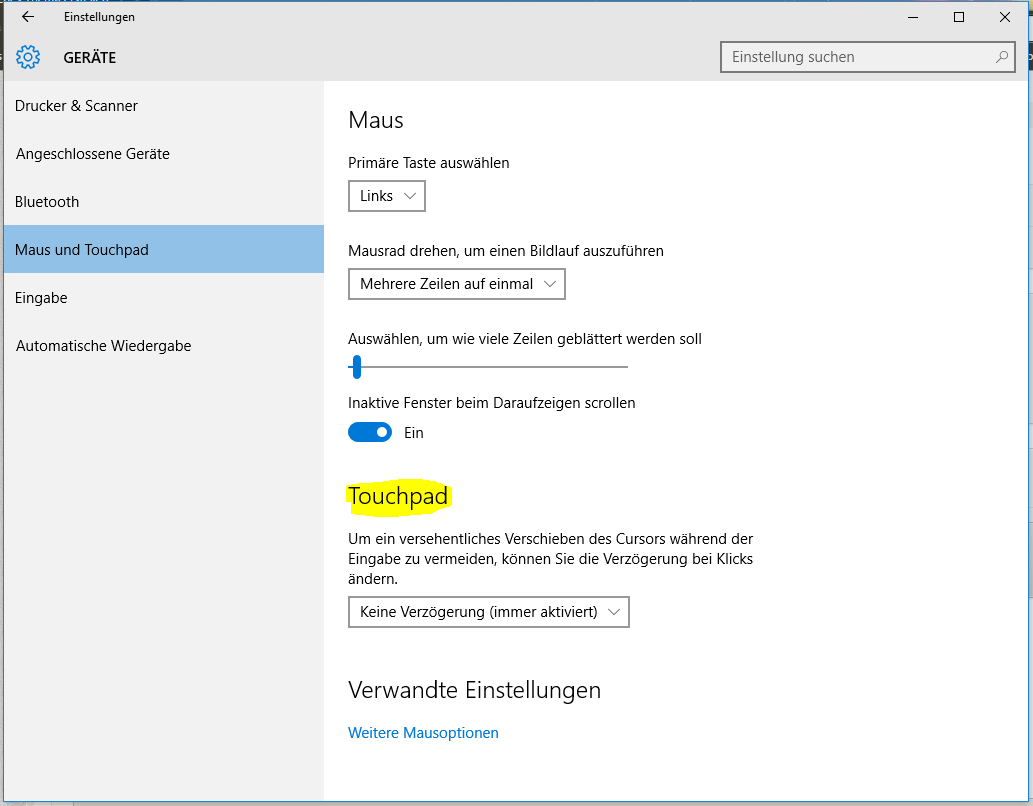 Grund dafür ist die Einstellung für das Touchpad im folgenden Bild, die Verzögerung.