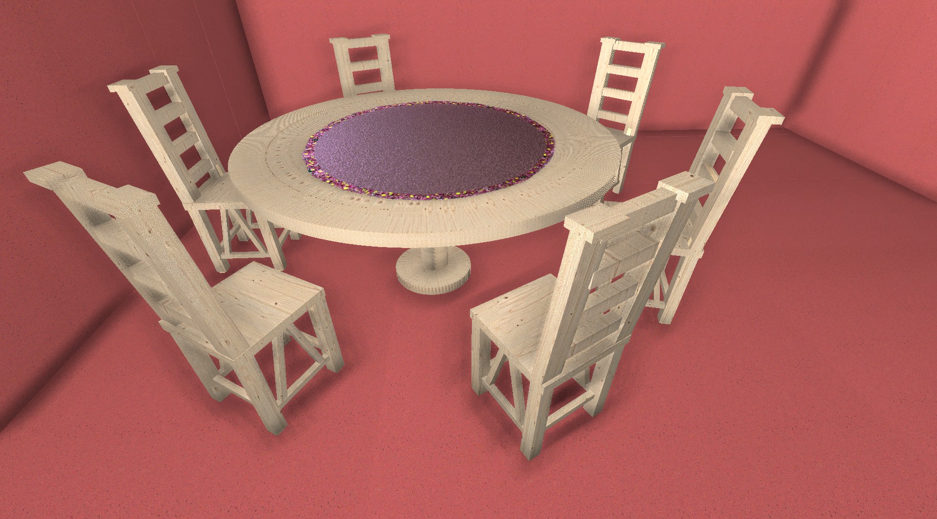 Hier mal ein runder Tisch mit Stuhl, auf dem man auch sitzen kann.