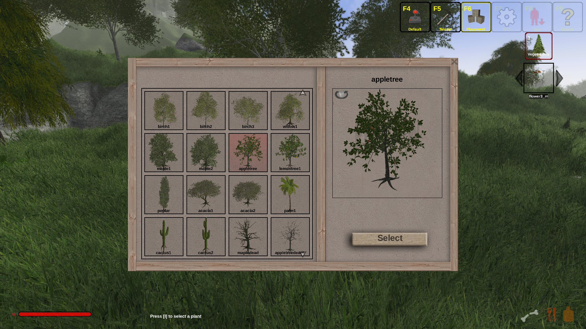 Dieses Update bringt ebenfalls ein neues Werkzeug für den Creative-Modus: Die Möglichkeit, Pflanzen zu platzieren (F6). Es kann jede beliebige Pflanze aus einer Liste gewählt und anschließend in der Welt platziert werden.