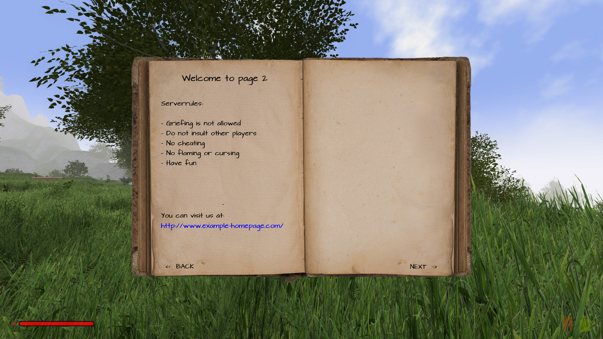 Hey Leute! Ein weiteres Update ist verfügbar. Es gibt Serverinhabern die Möglichkeit, eigene Seiten im Journal anzulegen. Dies könnte sinnvoll sein um bspw. die Serverregeln dort aufzulisten, oder andere Informationen die den Server betreffen. Hier ist eine Beispiel XML Datei dafür zu finden (einfach in das Serververzeichnis entpacken).