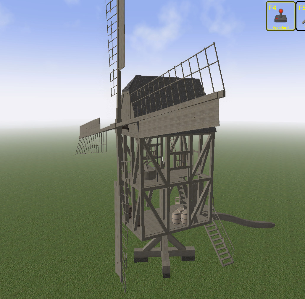 The House and the the vertical post are available separately to rotate individually - wich will make the covering much more easier too. Also I add the small toolbox, the crane with millstone and the complete setup of upper and lower millstone with the covering.