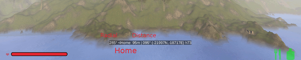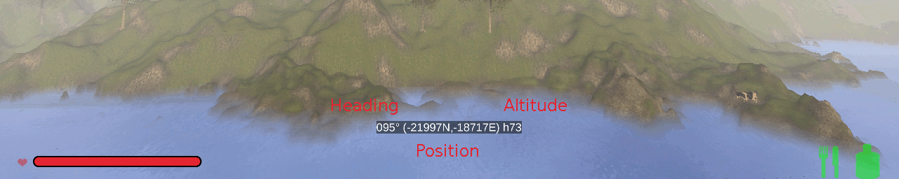 *) Displays current player heading as a standard navigation route and position in 'standard' geographic coordinates (N E) and block altitude: