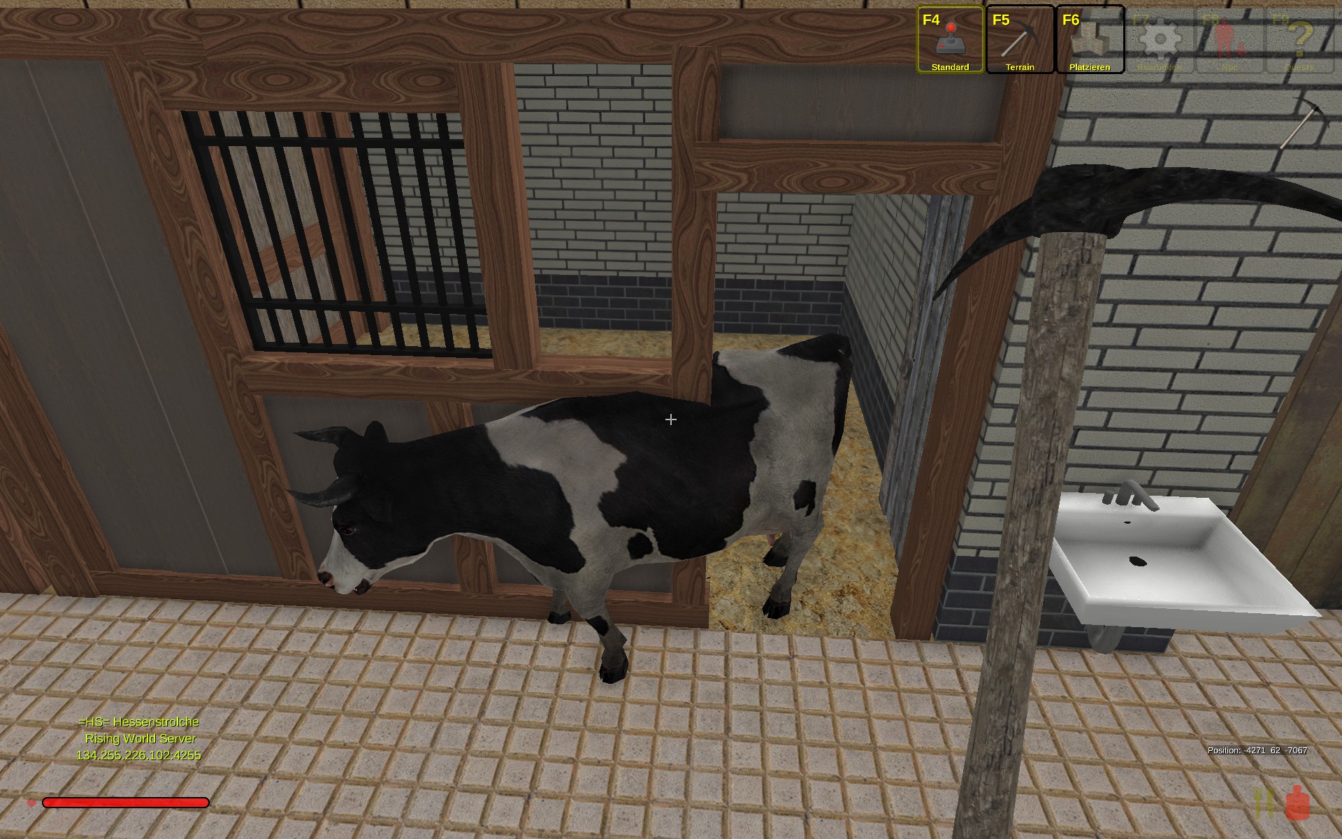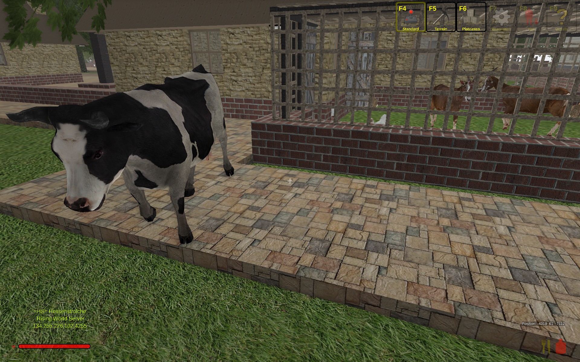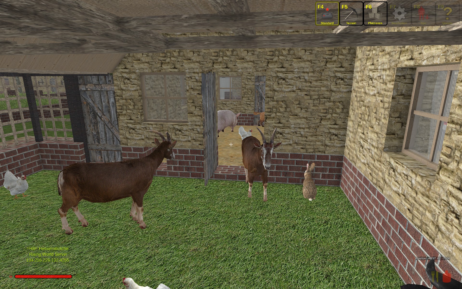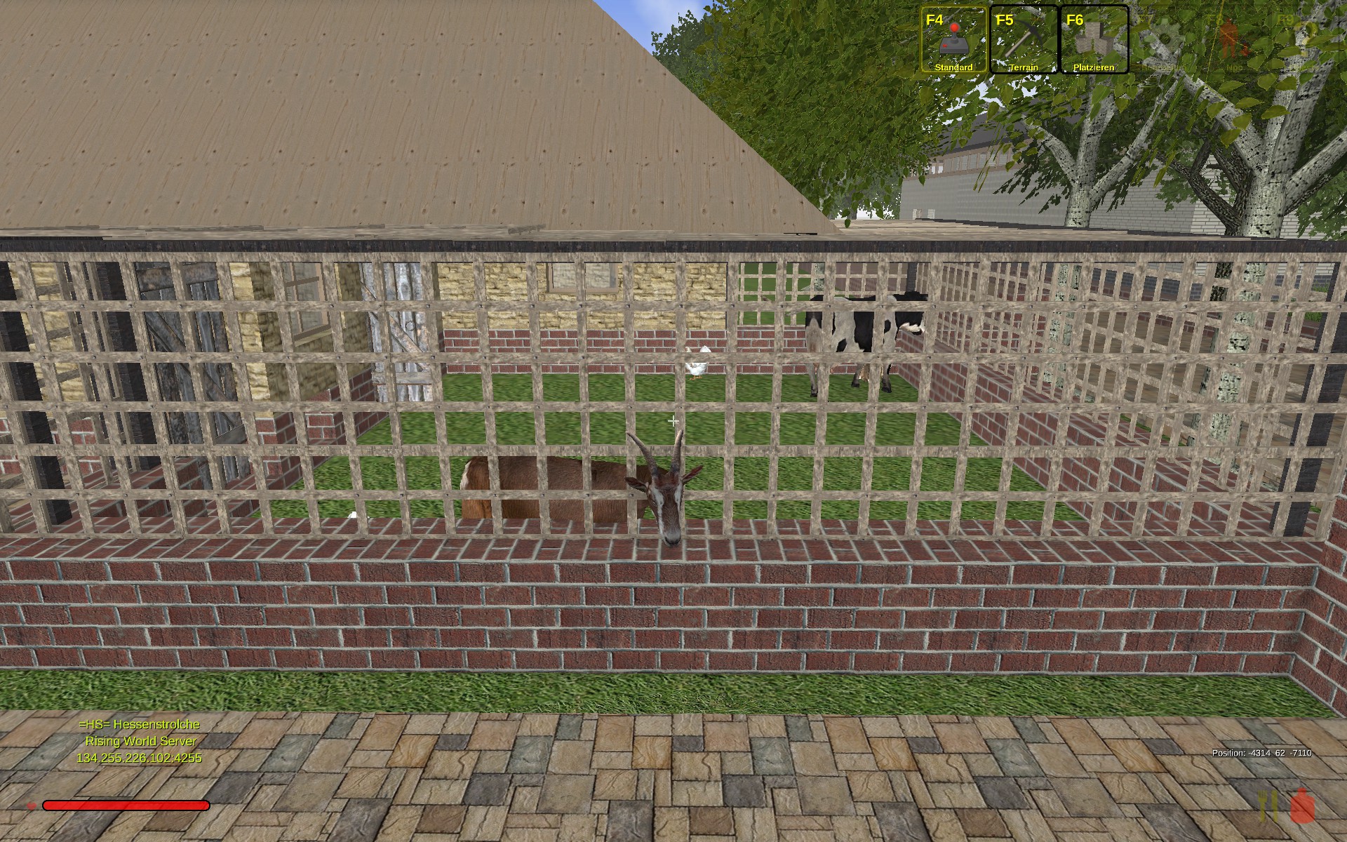 @red51zu dem halten der tiere in gehegen, im hühnersatall *bilder * funktioniert das recht gut jetzt nach 9h test,bis auf ein huhn und ein kaninchen sind alle tiere jetzt noch da auch im hinteren teil der mit mauern und türen versehen ist klappt das. selbstgebaute ställe und weiden die mit mauern und/oder brettern und balken umzäunt sind **grosse anlagen** gehen die tiere vereinzelt durch, wobei die tiere erst in die bauteile hinein zwitschen und dann mit der zeit auf der anderen seite hervorkommen. bisher eine ziege, eine kuh und ein huhn welche da fahnenflüchtig sind. was mir noch aufgefallen ist wenn man erst zu dem stall kommt ist der leer und verzögert ca bis zu 10 min später sind die tiere dann da bzw sichtbar da.