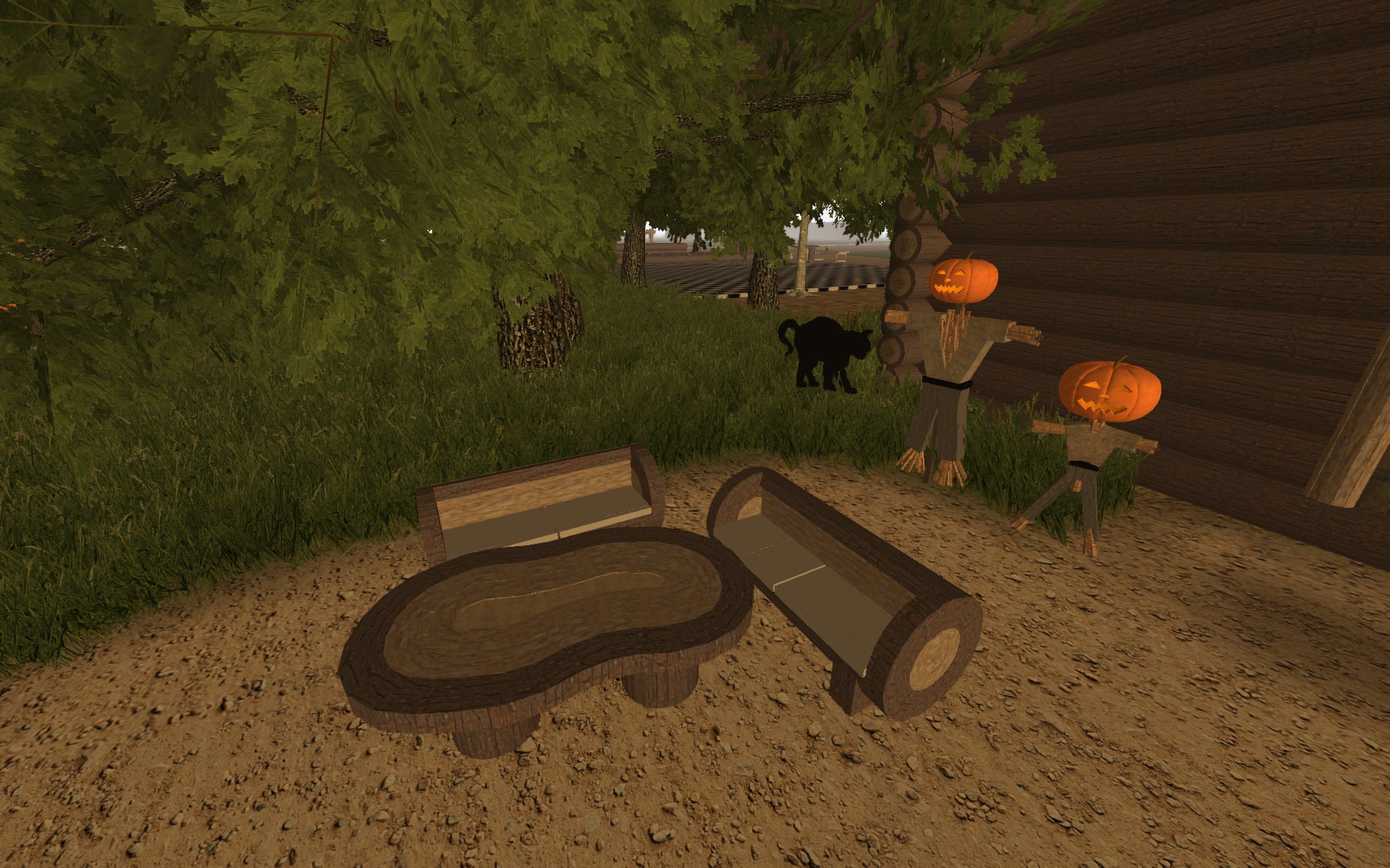 couch und tisch aus naturholz, ein vogelhexenhäuschen und die beiden vogelscheuchen.