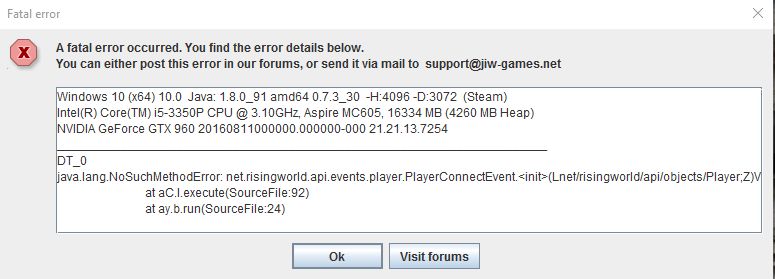 java.lang.NoSuchMethodError: net.risingworld.api.events.player.PlayerConnectEvent.<init>(Lnet/risingworld/api/objects/Player;Z)V
